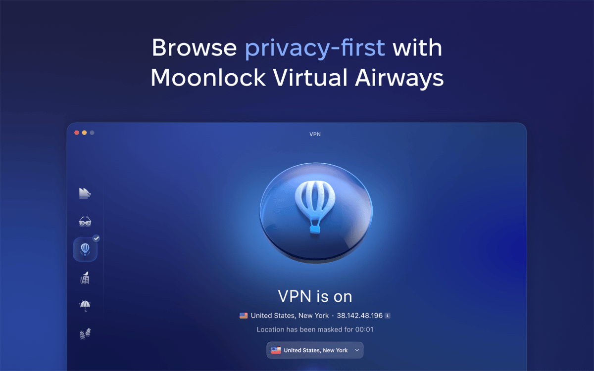 Your IP address can reveal your approximate location, internet service provider, and even help hackers piece together your visits on different websites. Moonlock hides this address with a VPN, replacing it with one from a secure server somewhere else in the world.
