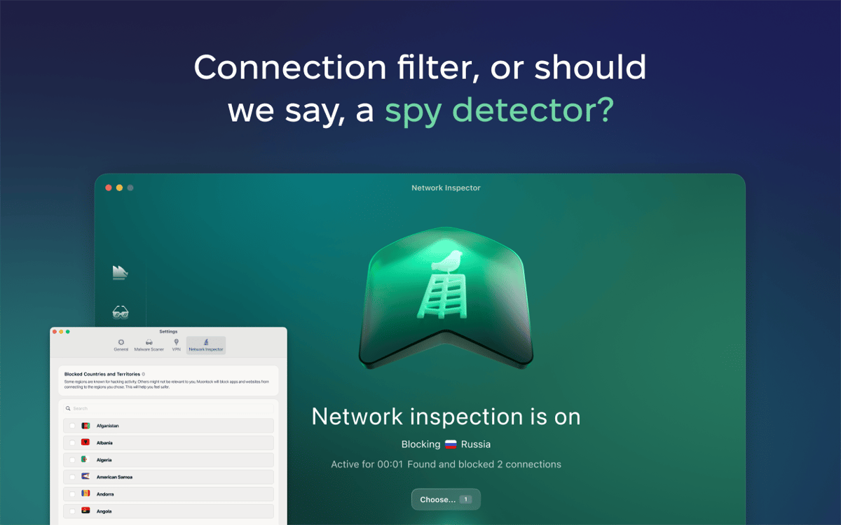 Some countries are known for hacking activity, and some are simply not relevant to you. If you never need to connect to those regions, why let them connect to your Mac? Use Moonlock to block these connections, and you’ll instantly cut off a major source of digital threats.