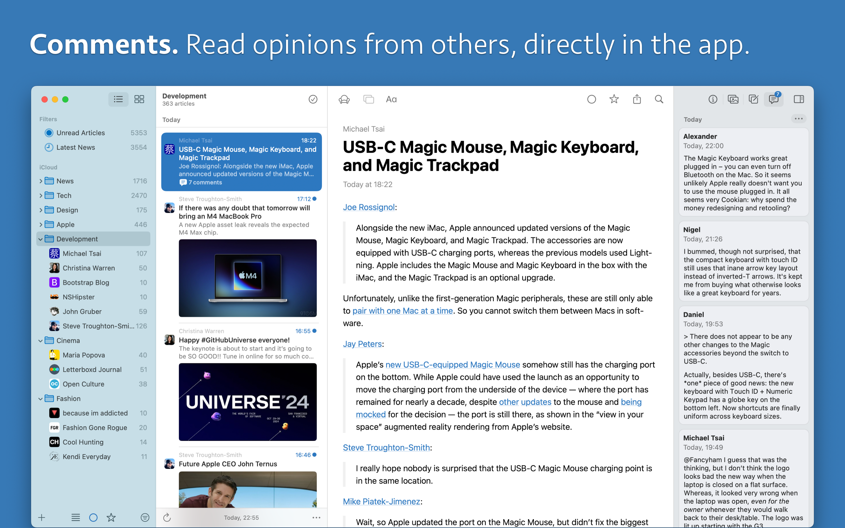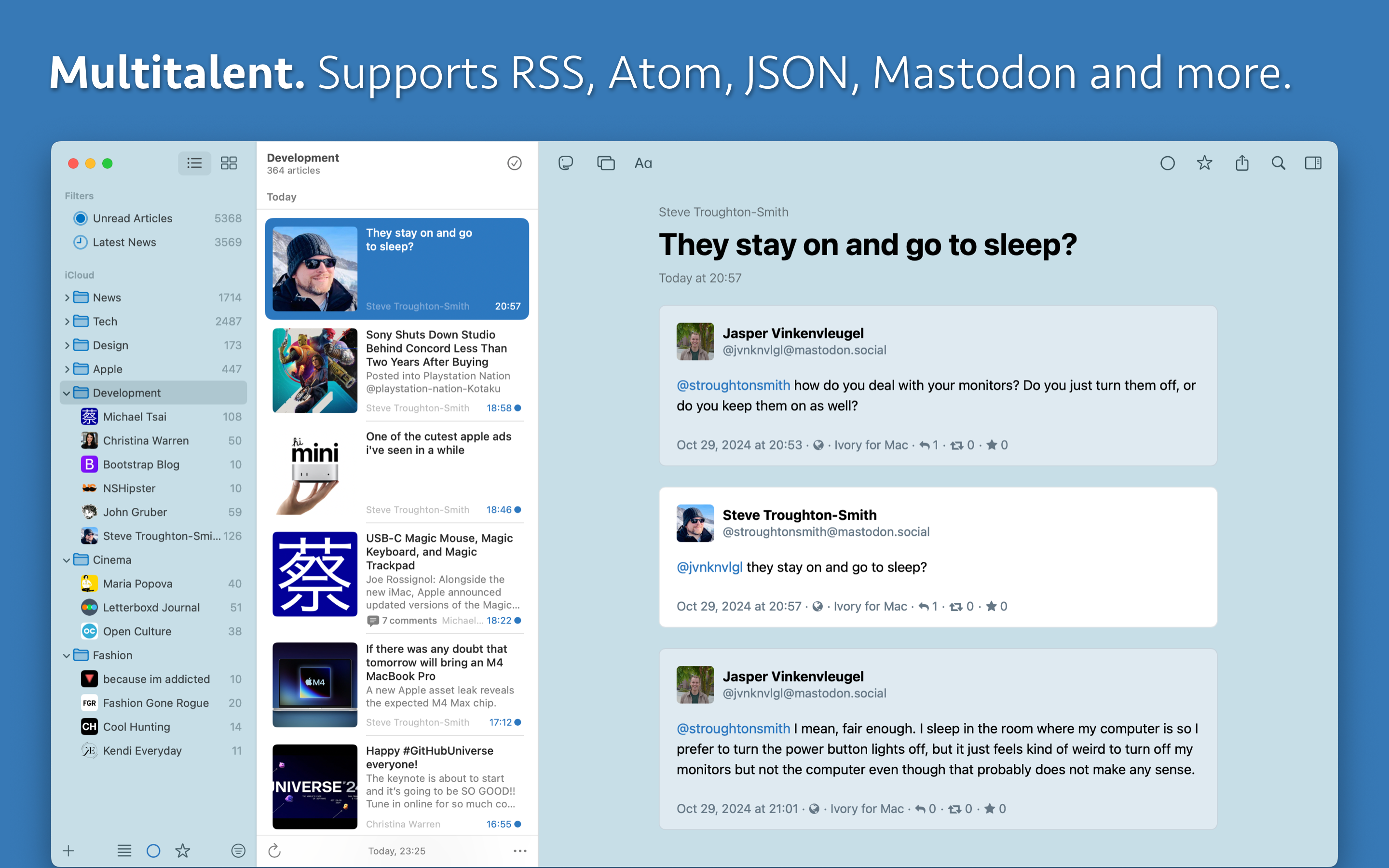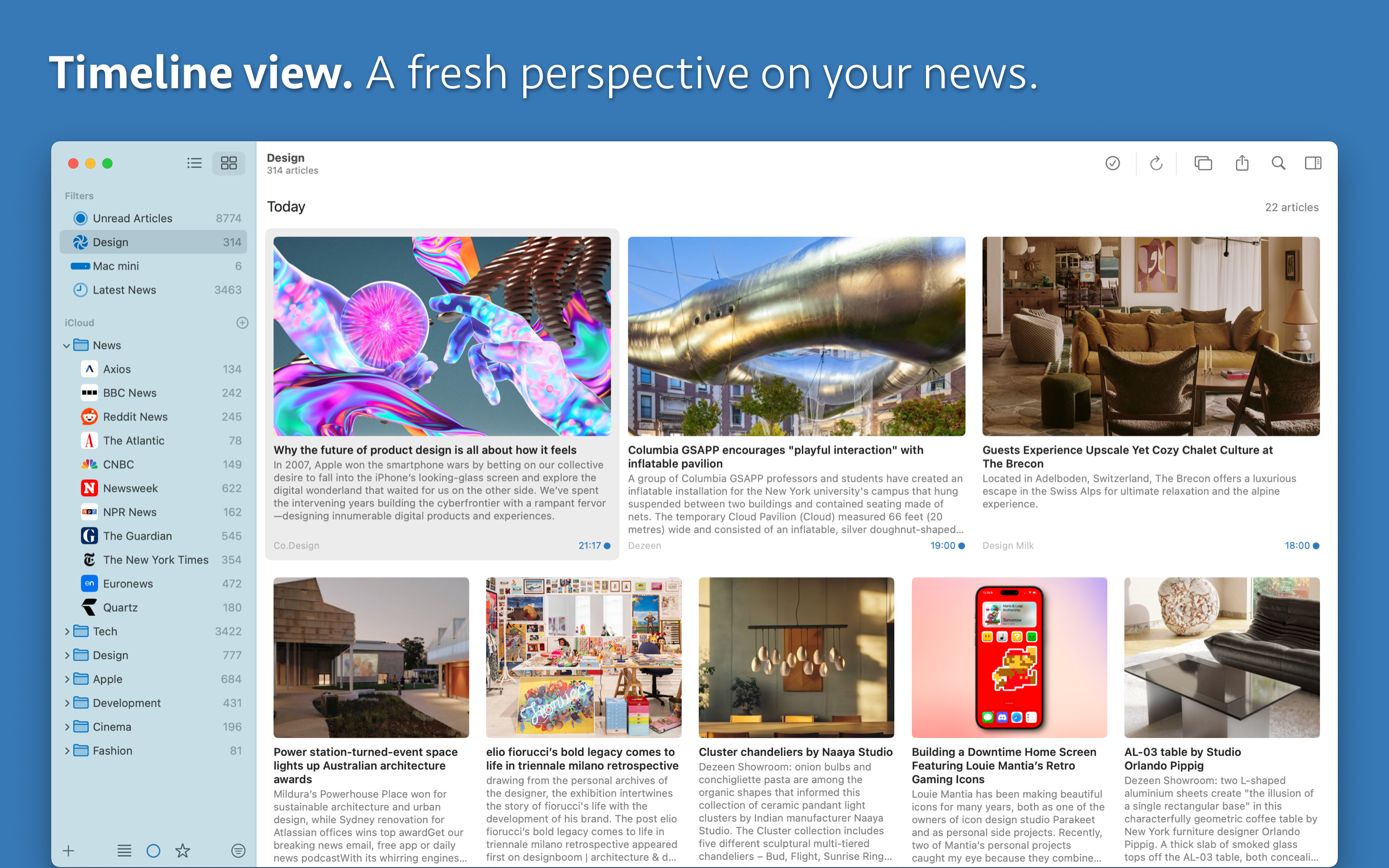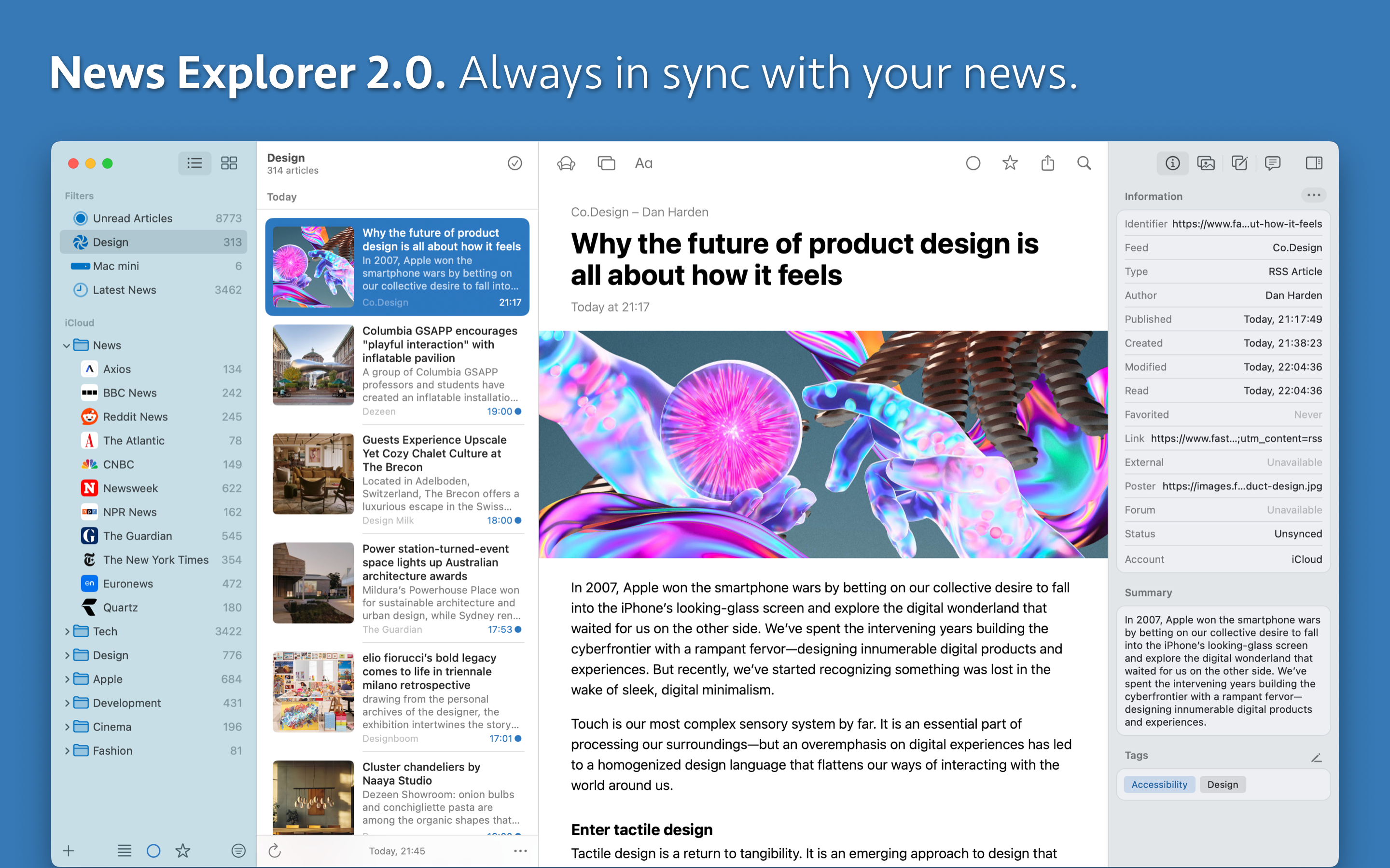 Gather all your specially-tailored news into one place, easily accessible. Set news feed to your needs. The desktop RSS reader app offers excellent iCloud synchronization. Enjoy having all your news and important content at your fingertips!