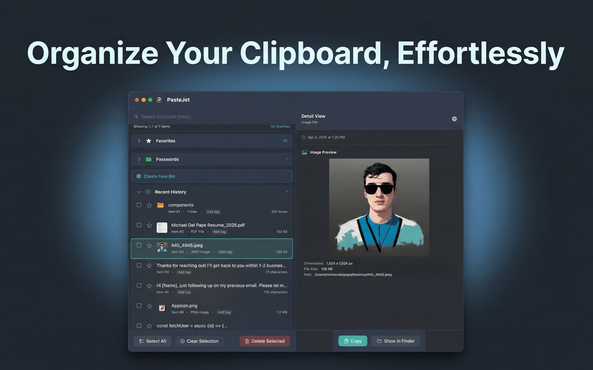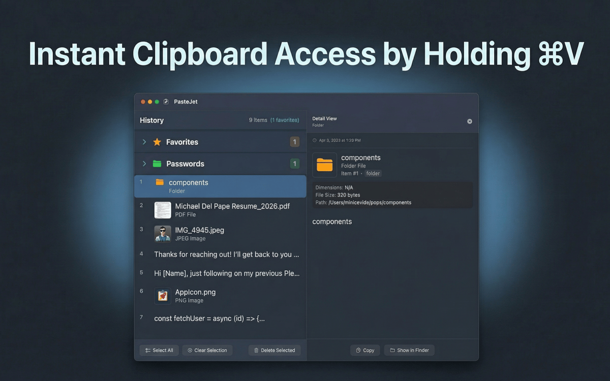 PasteJet is a clipboard manager for Mac that remembers everything you copy. It lives in your menu bar and works with a simple twist on Command+V — tap it to paste normally, hold it to browse your history. Text, images, files, links — it keeps them all and lets you find what you need fast.
