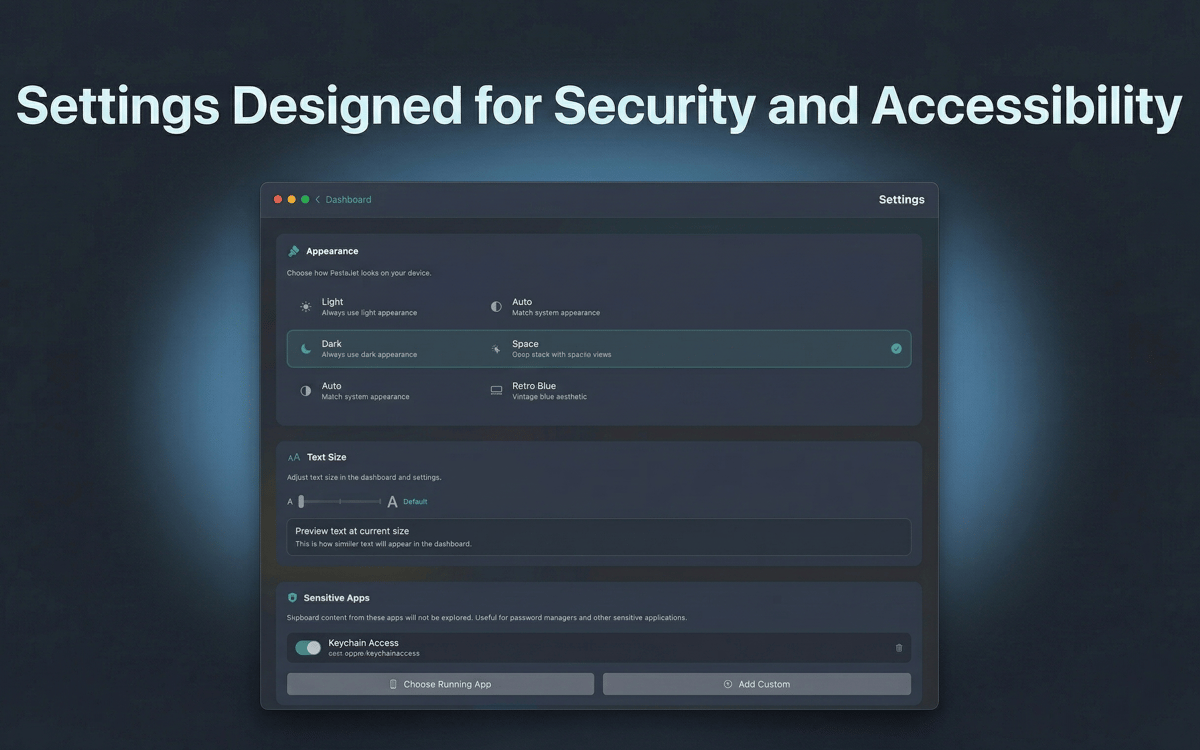 PasteJet automatically saves everything you copy — text, images, files, and links. Scroll through your history or search to find that thing you copied three hours ago.