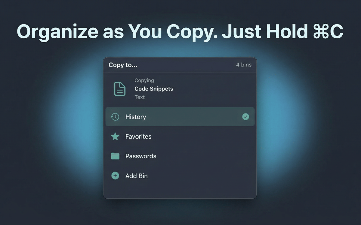 No new shortcuts to learn. PasteJet hooks into the keyboard shortcut you already use. A quick tap pastes your latest item. Hold it down and a popup appears with your full clipboard history, ready to pick from.