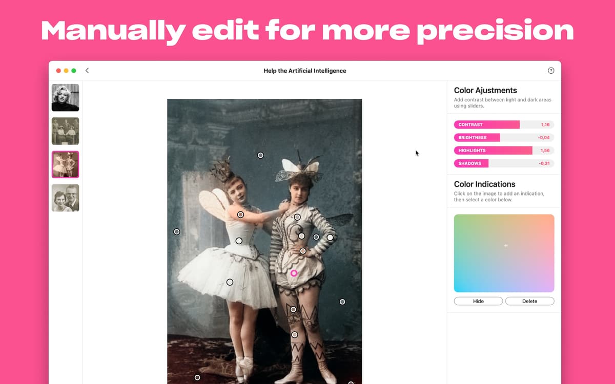 If you want to get creative with your old photos, achieve a specific look, or simply know what your subjects looked like in real life when the images were taken, you can provide points of colors to help AI be more accurate, as well as adjust image brightness, contrast, and more.