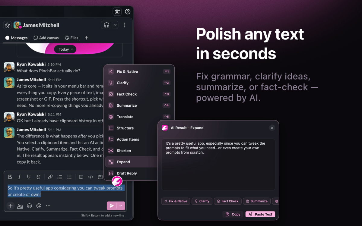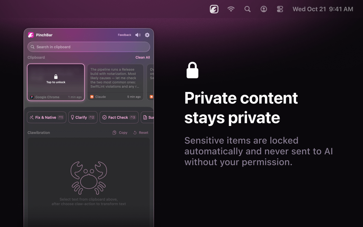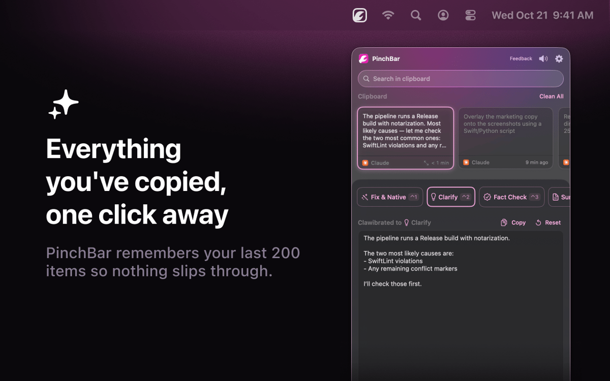 PinchBar is an AI-powered clipboard tool for Mac. Copy anything, press ⌥V, and your menu bar surfaces smart actions — rewrite, summarize, translate, fact-check, or structure your text in seconds. Works with Apple Intelligence (on-device and private), Setapp AI. Sensitive data like passwords and tokens gets detected and locked automatically. No app switching. No extra tabs. Just copy, click, paste.