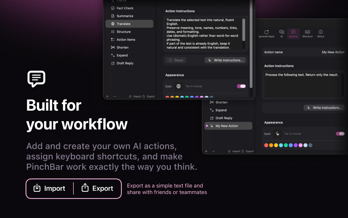 Six ready-made actions ship out of the box: fix grammar, clarify, fact-check, summarize, translate, and structure. Edit the system prompt, swap the icon, create your own, and drag to reorder. It's yours to shape.
