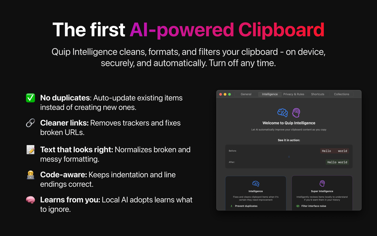No more messy clipboard history. Quip Intelligence automatically strips tracking junk from URLs, normalizes code formatting, and cleans up messy whitespace. It also uses Apple’s on-device Foundation Models to summarize long text and suggest the right collections — without your data ever leaving your device.