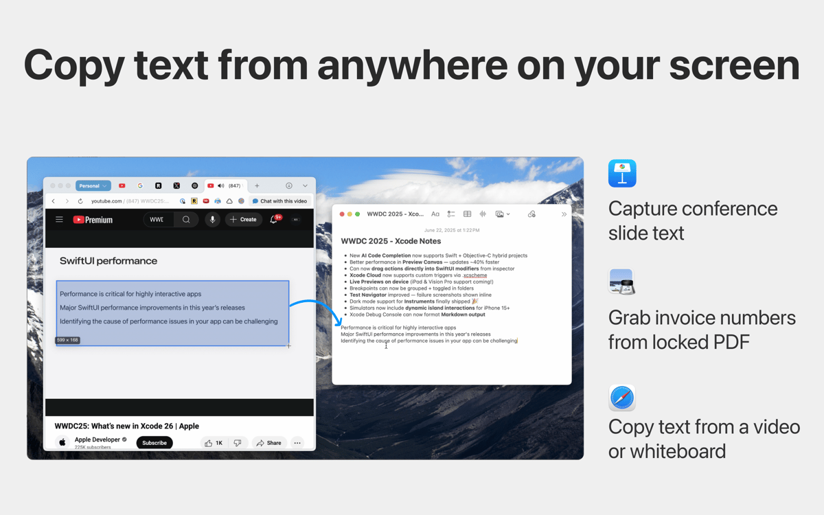 Sometimes information is trapped in a video, a locked PDF, or a presentation slide where text isn’t selectable. Quip’s “Grab Text” tool (Command + ⇧ + 2) uses high-accuracy OCR to extract text from anywhere on your screen. This turns visual data into editable text instantly, making it easy to pull a promo code from a screenshot, a quote from a YouTube video, or text from a locked PDF without retyping them.