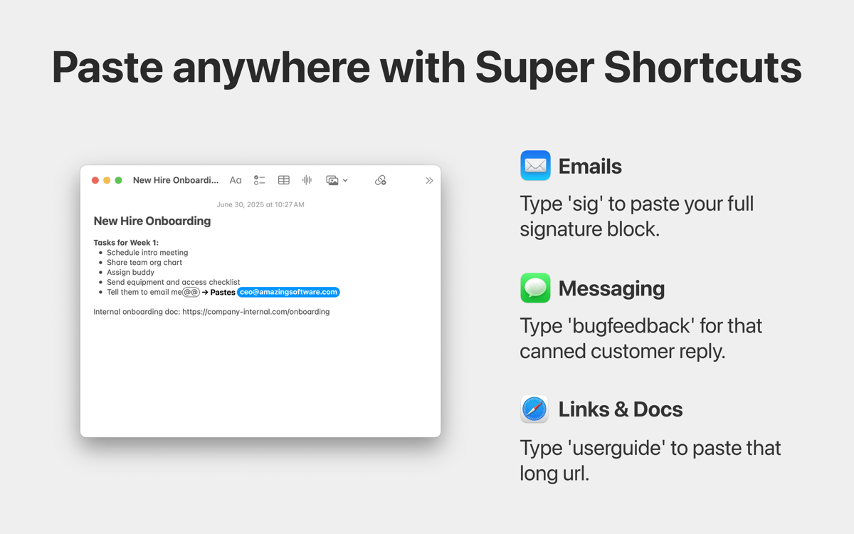 Turn your most-used text into “Super Shortcuts.” Assign a short trigger to any item in your history to instantly expand full email templates, canned replies, or complex URLs in any app. This built-in text expander scales with your clipboard, eliminating hours of manual typing from your weekly routine.