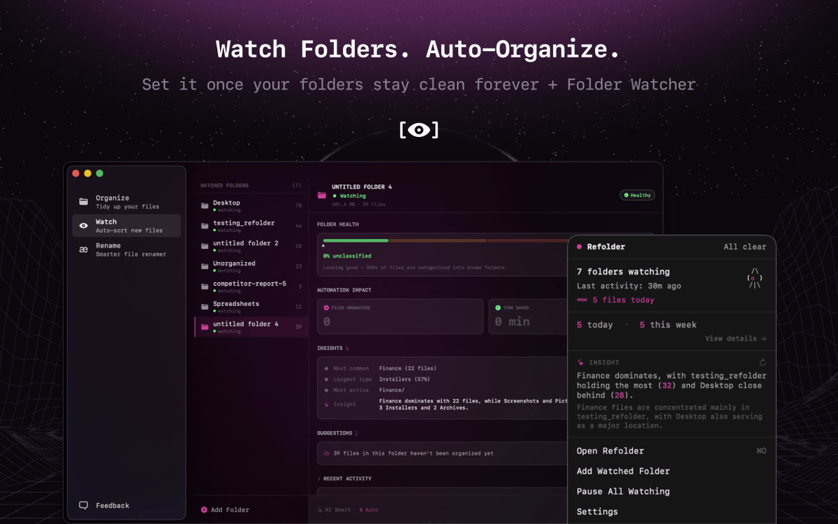 Refolder — file organizer for Mac. A calmer way to clean up busy folders without breaking your flow. It watches your folders, suggests where files belong, and keeps everything sorted in the background. Review changes when you want — or let it quietly do its thing.