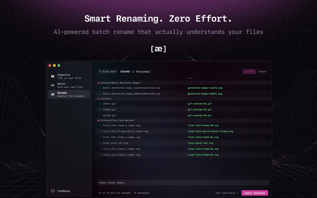 Rename hundreds of files using smart presets or custom patterns. Quick, flexible, and no Terminal needed.