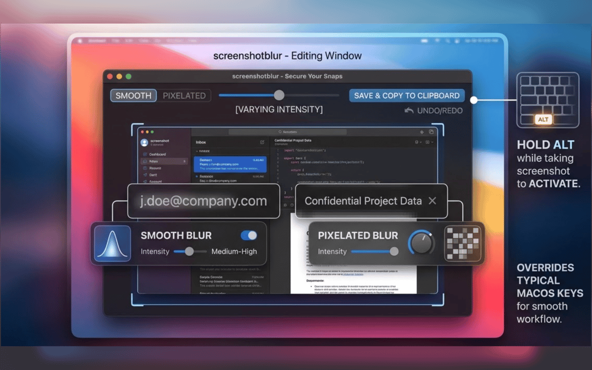 No reopening files. No digging through folders. Take a screenshot with the built-in macOS shortcut, hold Option, and Screenshot Blur opens the image immediately so you can clean it up on the spot.