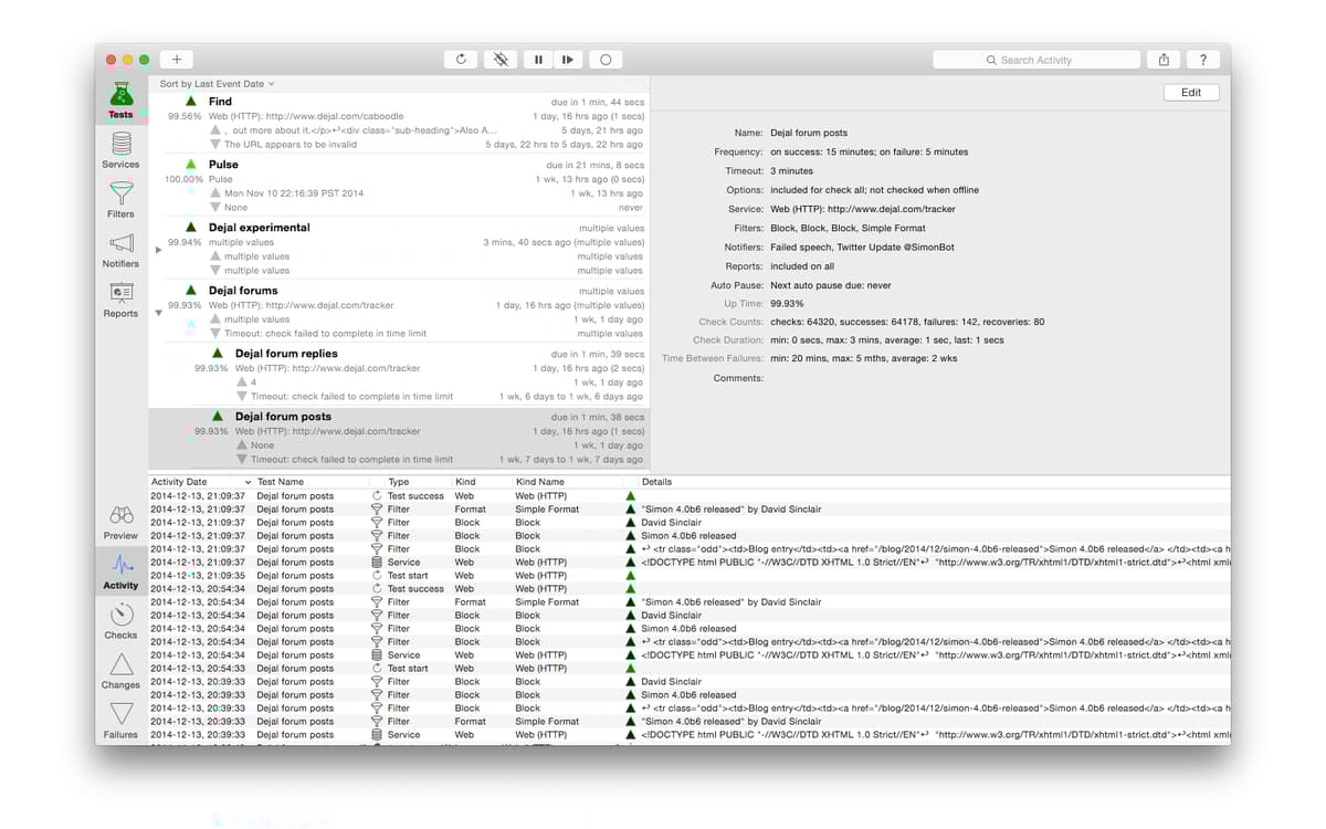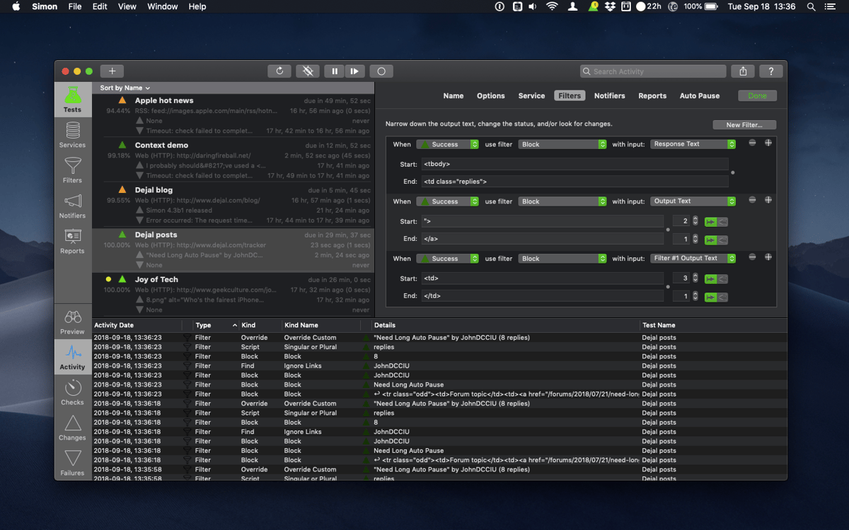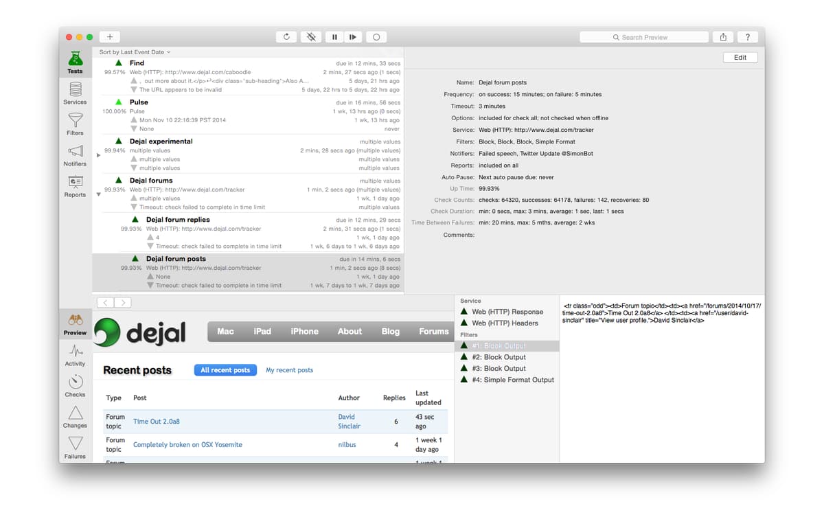 Track websites, check updates using smart filters. There are numerous filters on offer. For instance, you can set filters to ignore HTML tags or pairs. With the basic text matching, find some text in the output. Use the standard format filter if you need to reformat some text. Filters can be customized, or you can even add new ones via AppleScript or shell scripts.