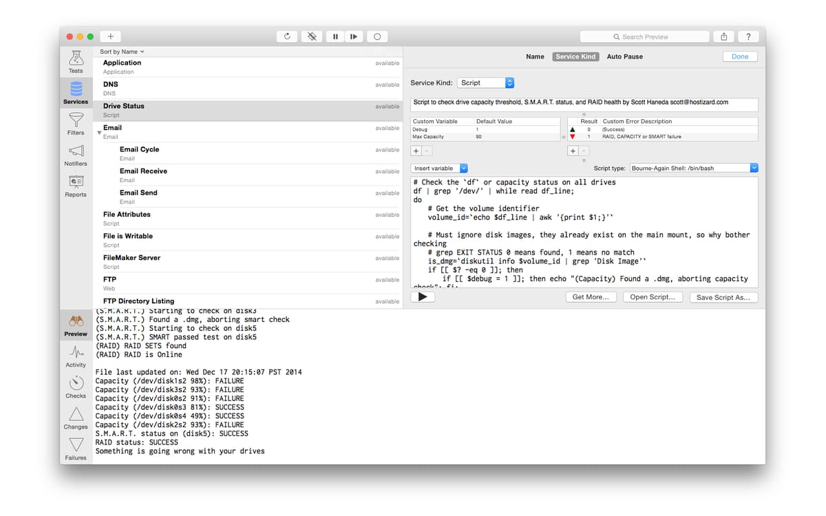 Check the sites, servers, and apps status and get HTML reports. See them in the browser of your choice. Choose whether you want them to be automatically saved or to be sent to a remote server. There are an array of templates to help you control layout and content in the report feature.