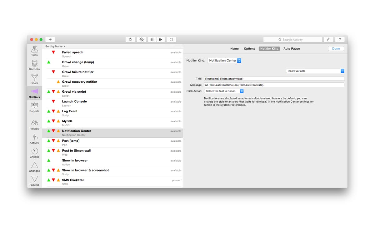The app boasts a pretty solid pack of notifiers, including action, calendar, email, sound, speech, and more. If needed, share notifiers among numerous tests. Write an AppleScript to get your ultimate notifications. If some of the notifiers bother you, they can be automatically stopped for a specific period