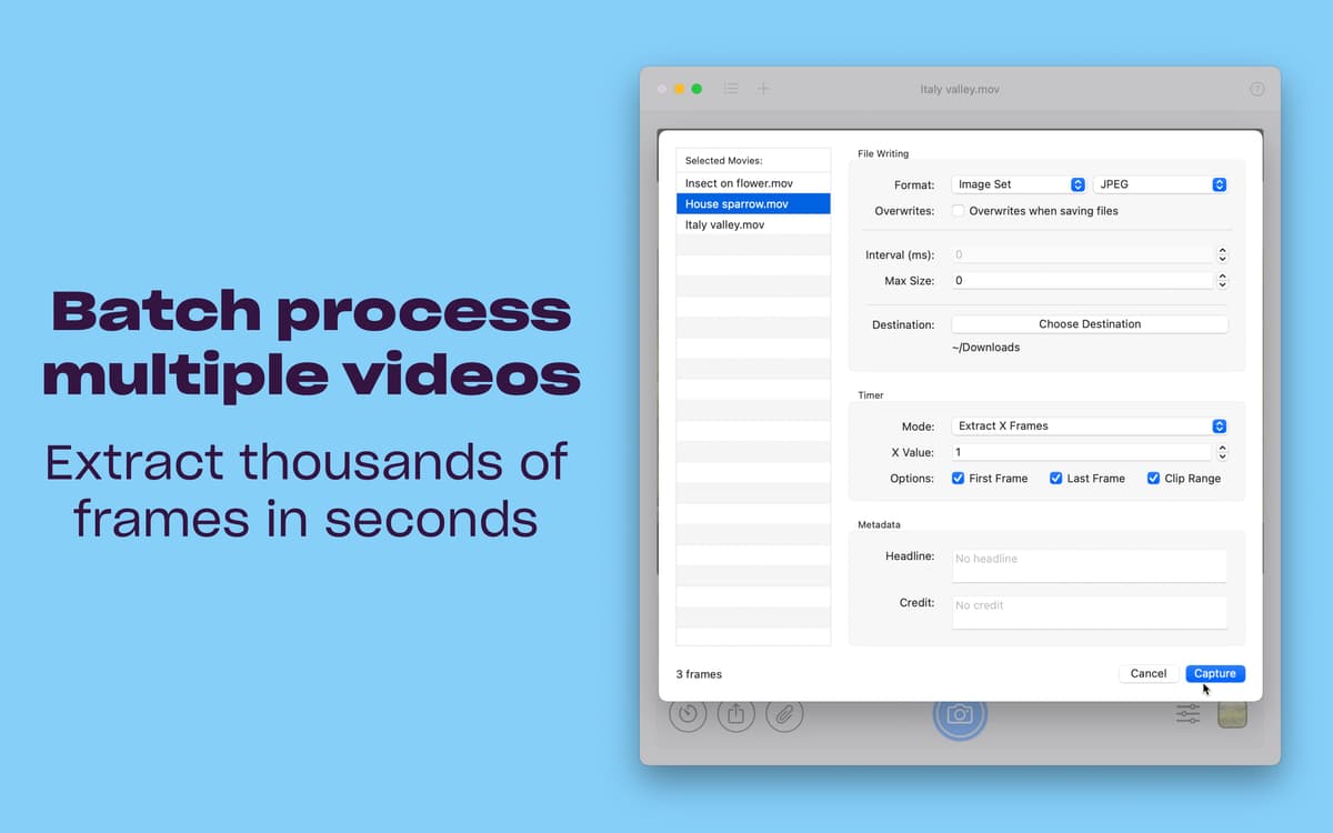 If you need to capture many images from your video, SnapMotion is up for the task. The app allows you to extract numerous images from your video in batches. You can also create GIFs or MP4s out of your images.
