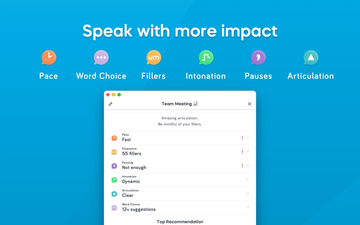 For each recording you make, you get a report with statistics and suggestions to help you speak with more confidence, clarity, and empathy. Review feedback on your pace, pauses, intonation, and enunciation. Your transcript is also analyzed for fillers, conciseness, jargon, and non-inclusive expressions.