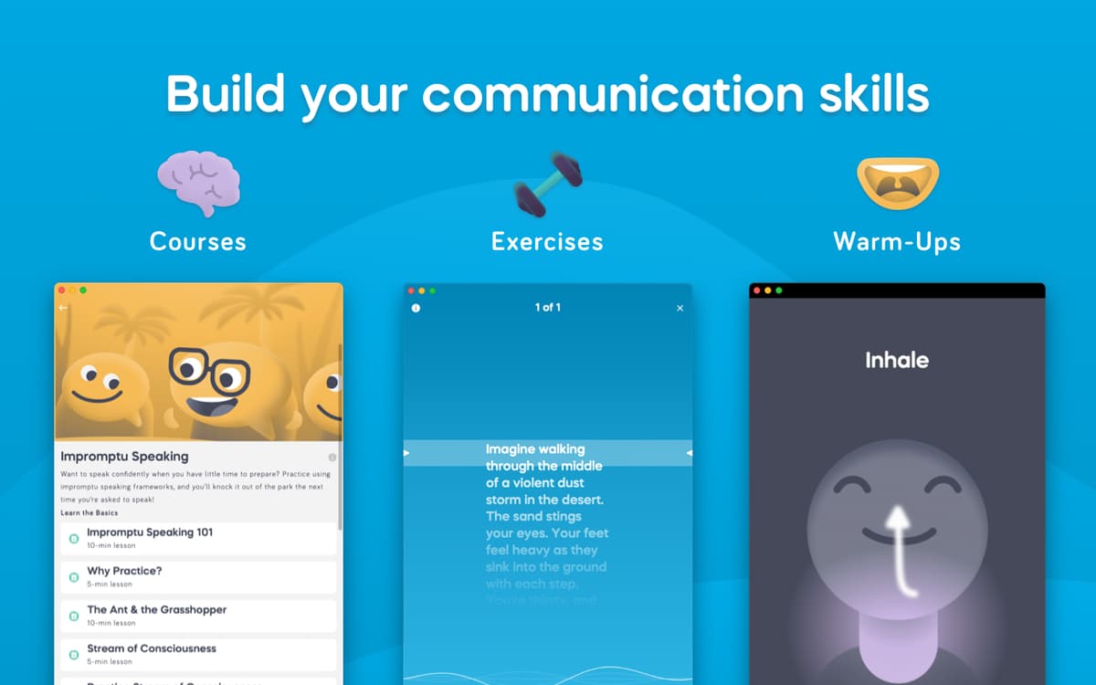 Consistency is key. Based on your speaking style, you are matched with interactive exercises to help polish up your skills. You’ll get outside of your comfort zone and use your voice in new ways. Speeko also offers daily vocal warm-ups to build your muscle memory for an expressive and engaging voice.