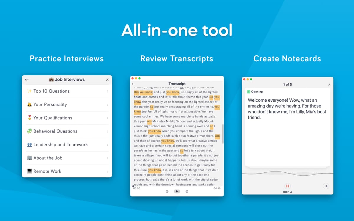 From meetings to presentations, record your speaking and analyze it. Speeko works with Zoom, Slack, Microsoft Teams, Google Meet, and other virtual meeting software. If you are preparing for an interview, create a timed session with Speeko’s library of common interview questions. Your recordings are stored directly on your device, so don’t worry about your sensitive information being shared without your permission. You can import recordings into Speeko too!