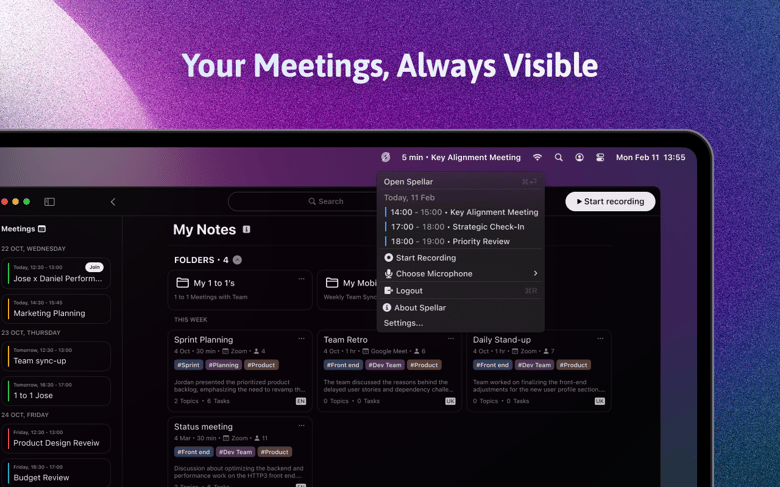 Never miss a meeting again with Spellar's intuitive calendar integration. Sync effortlessly with Google and Outlook calendars, and access everything through a sleek menu bar interface. Start recording with a single click—staying organized has never been easier.