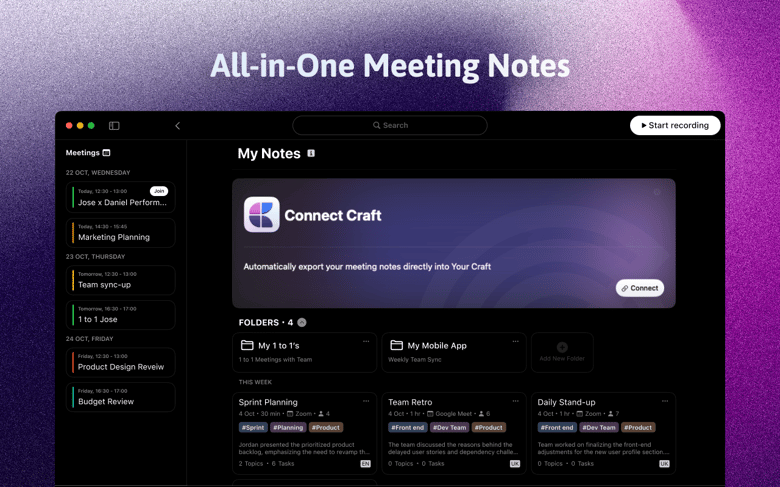 Supercharge your productivity with Spellar's integration ecosystem. Connect seamlessly with Craft, Notion, Miro, Linear, and more to automatically export summaries and action points to your productivity tools. Let Spellar handle the workflow while you focus on the conversation.