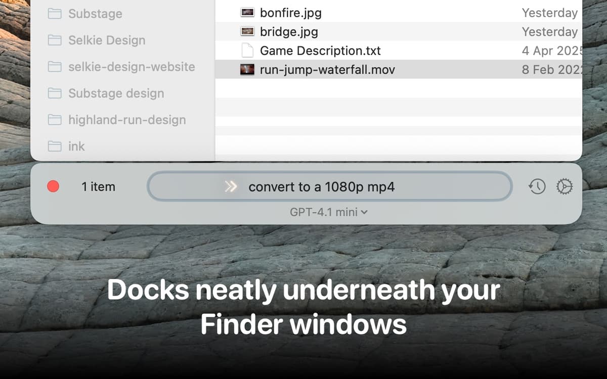 Easily convert images, videos, and other files with simple commands like “Convert to JPG” or “Make a 1080p MP4 from this MOV,” all without needing to open other apps.
