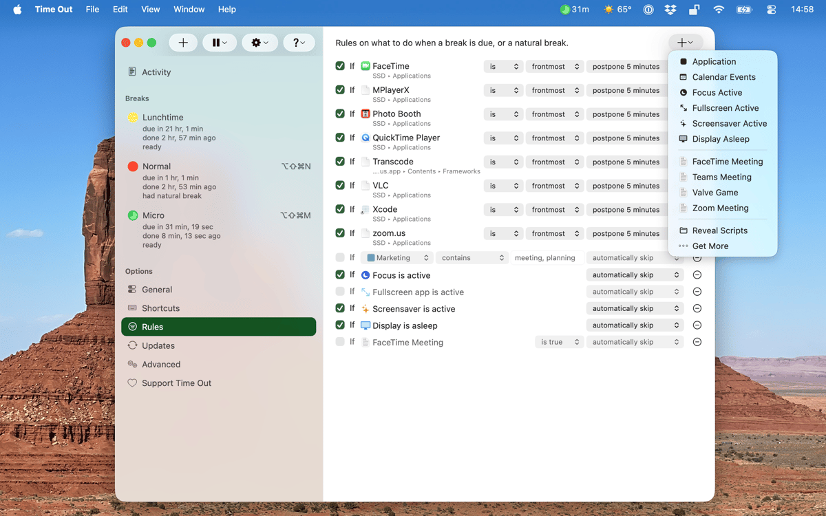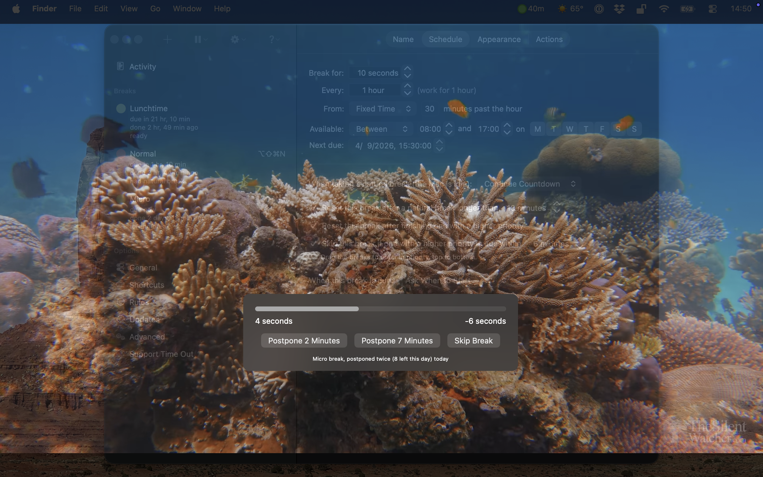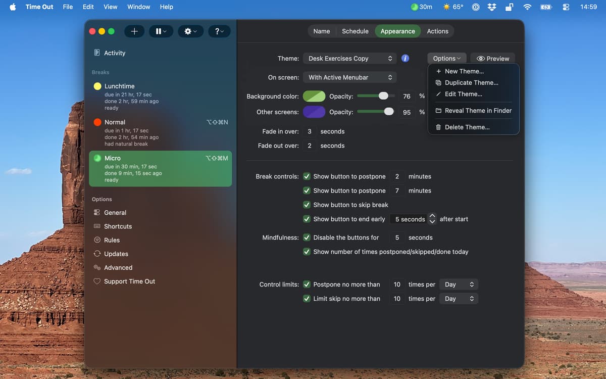 You have all the freedom you need in terms of managing the breaks. Disable micro breaks if they feel redundant, change the duration, add new kinds of breaks, or set repeated pauses for lunch. What’s more, you can set the app to count backwards when you step away from your Mac.