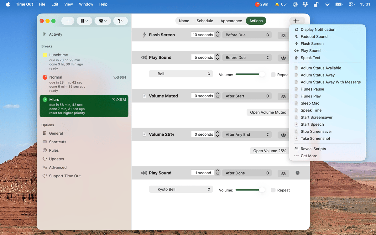 Here’s the fun part. You can enable Time Out to speak to you, play music, or even run a custom Automator Workflow when a break starts or ends. To set the app perform actions, navigate to the Actions tab, click on the plus button, and choose the way Time Out should signal a break.