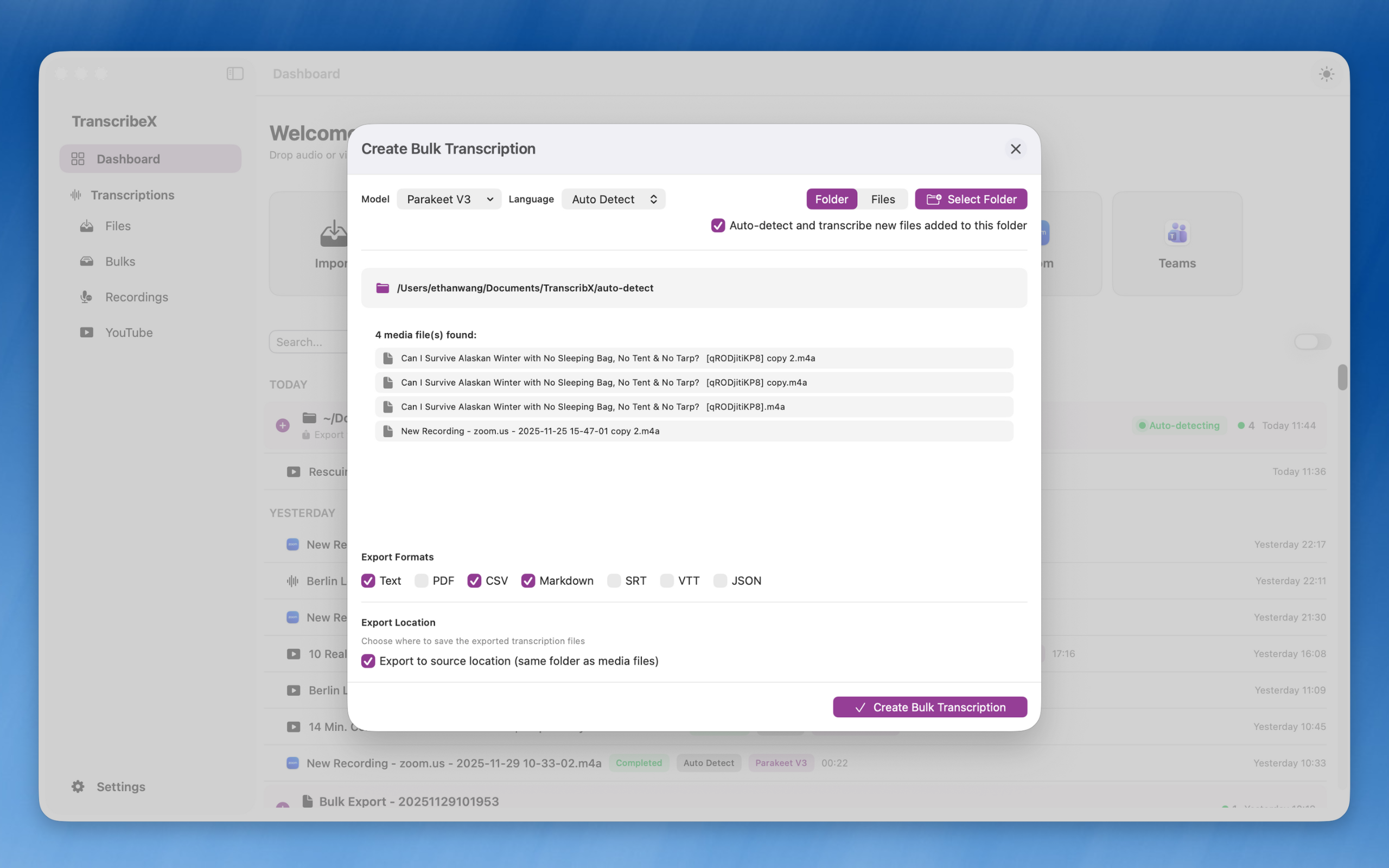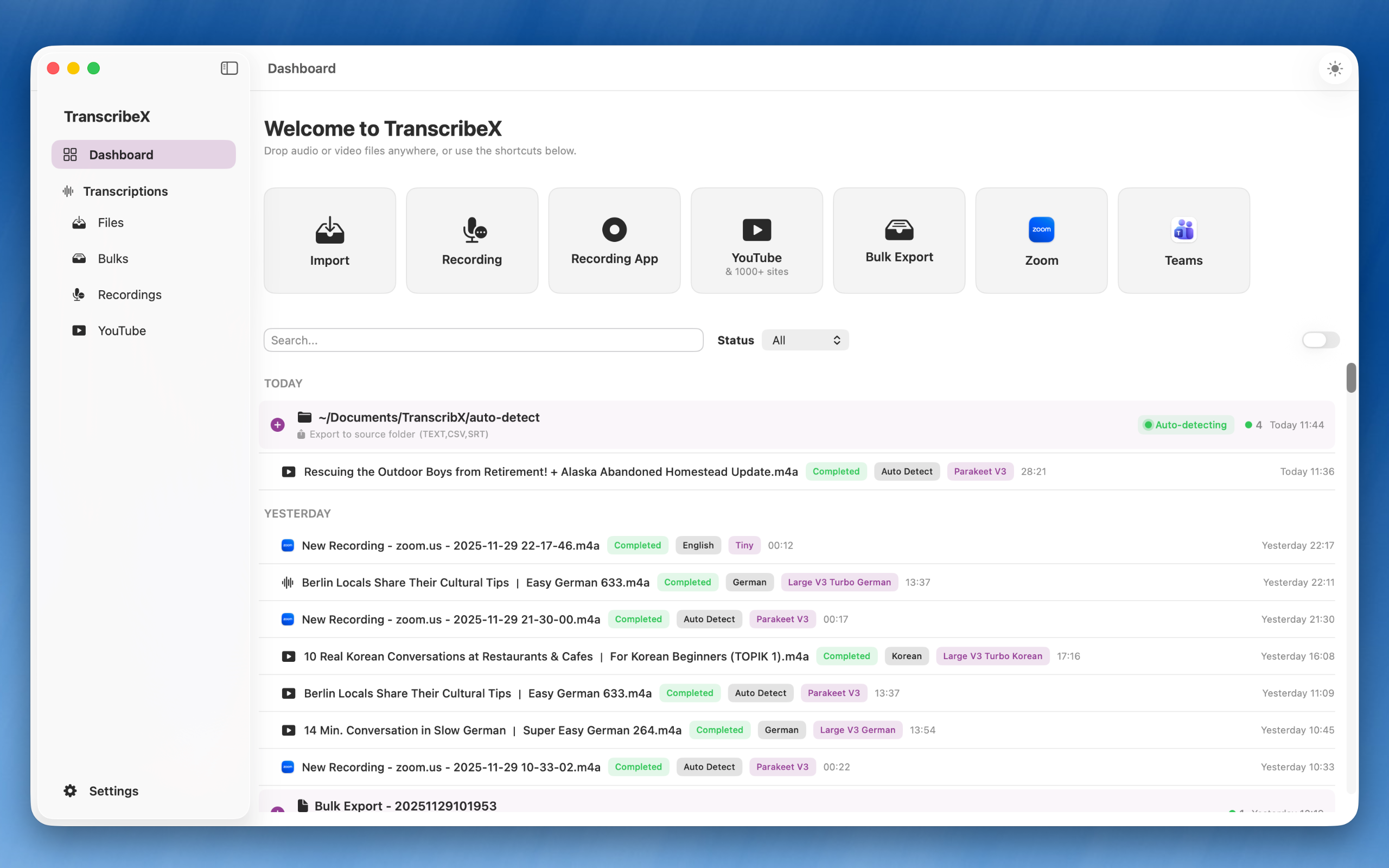 TranscribeX makes it easy to turn your recordings into precise transcripts using OpenAI Whisper, Parakeet, and Apple Intelligence. Simply import audio or video files from your Mac, drag and drop them into the app, or record directly using your microphone. You can even capture audio from other apps (Zoom, Google Meet, etc). And when you’re dealing with larger projects, you can transcribe multiple files at once, saving time and keeping your entire workflow moving smoothly.