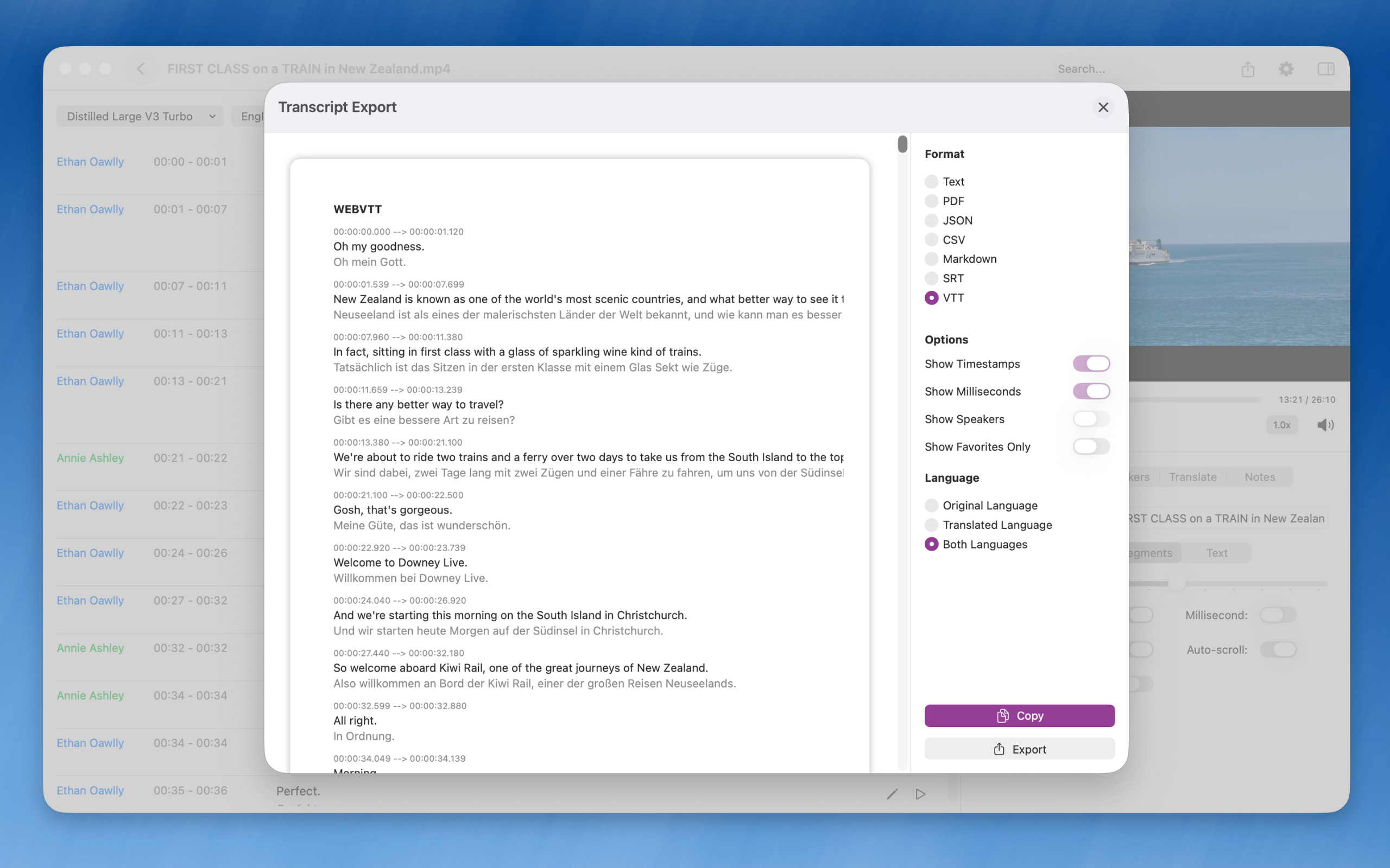 Once your transcript is ready, you can merge or split segments, customize speaker names, reflow segments by character or word count, or manually adjust timestamps for perfect alignment. Word-level text following keeps your place as you play the audio or video, and speaker diarization automatically identifies and labels different voices.