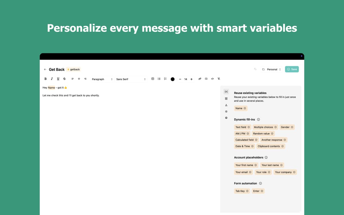 Add personalized details like names, dates, or custom fields directly inside your snippets. Choose from multiple options on the fly with multi-select variables. Stop rewriting the same message just to change a few words.