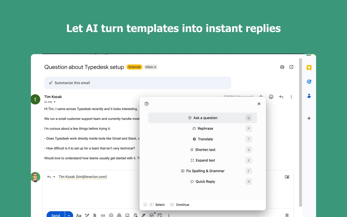 Typedesk works everywhere on your Mac: email clients, browsers, chat apps, and code editors. Your shortcuts sync across your devices so you're always productive, wherever you are.