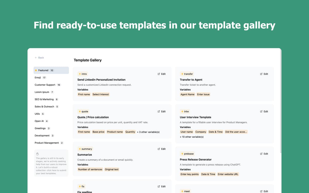 Save the emails, greetings, and phrases you type every day. Organize them into folders, find what you need in seconds, and insert it without breaking your flow. The more you use it, the more it works for you.