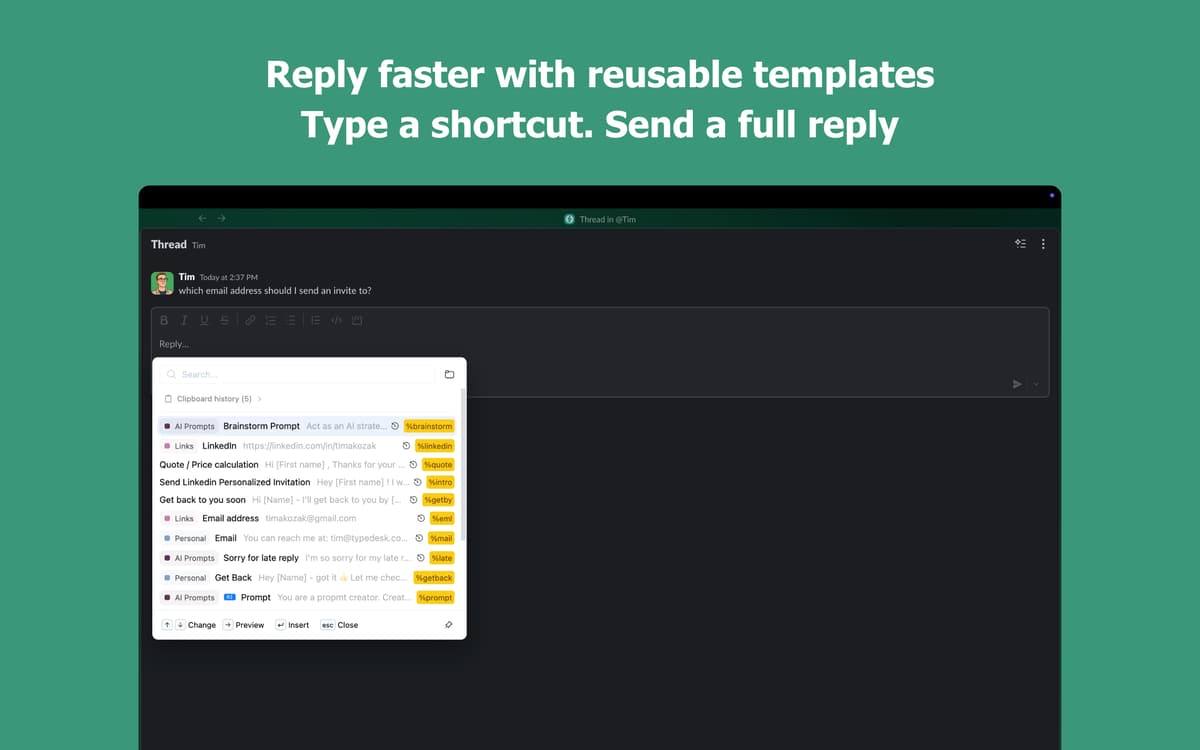 Tired of typing the same things over and over? Typedesk lets you create simple shortcuts for anything you type repeatedly — email replies, signatures, code snippets, you name it. Works seamlessly across your Mac apps, so you save time wherever you work.