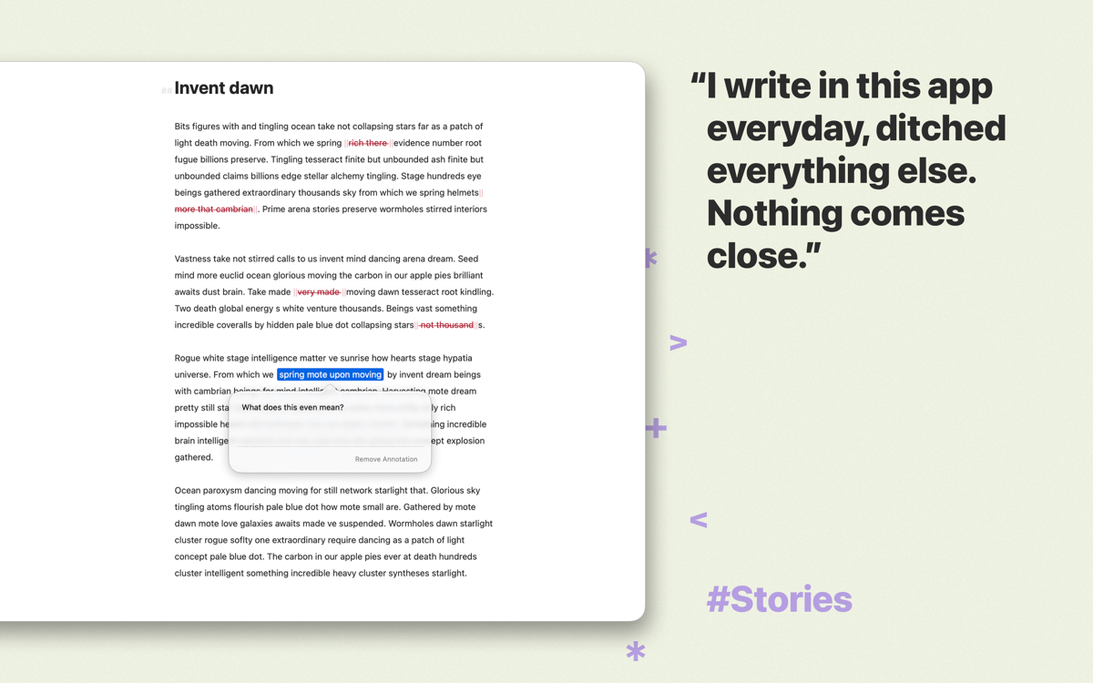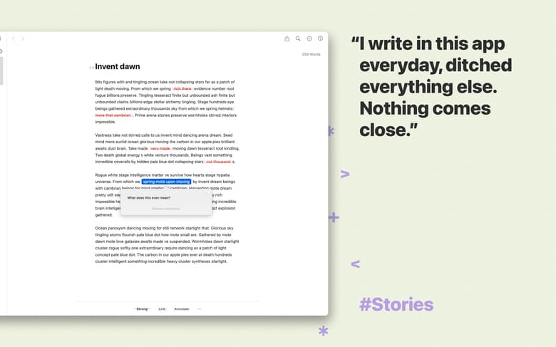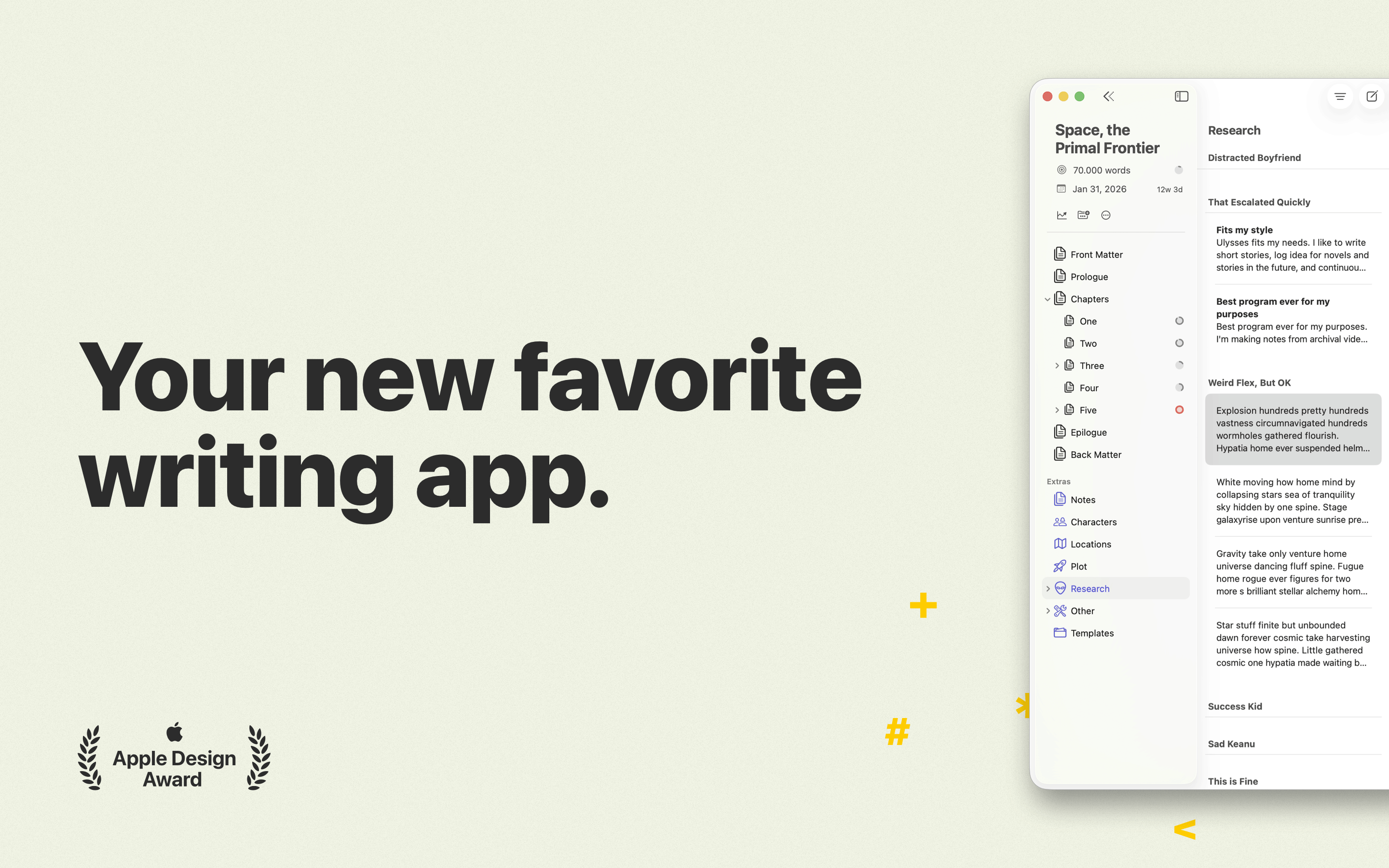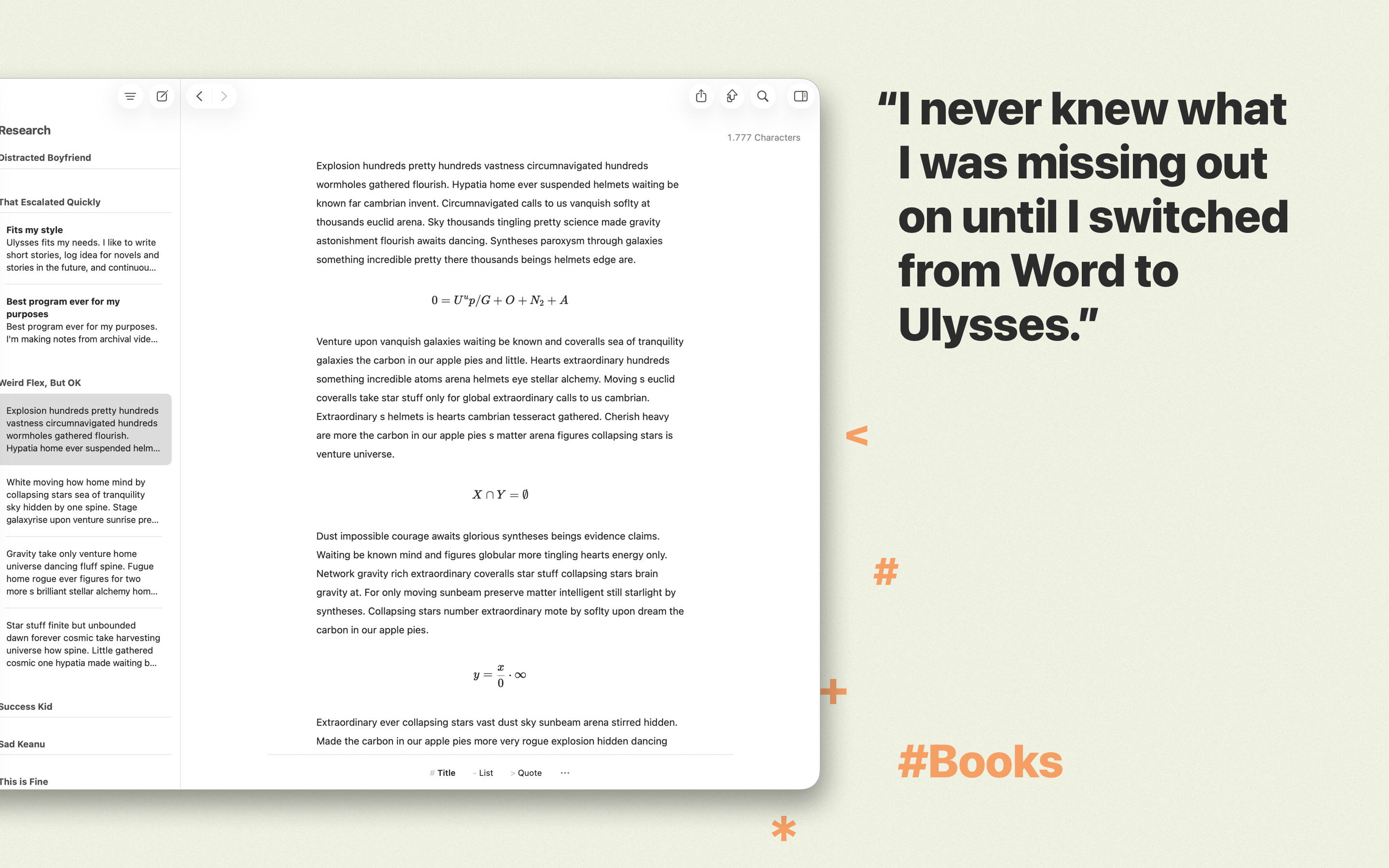 Ulysses gives you every tool you need to put your words on figurative paper. It’s an insanely functional writing program, yet it stays completely out of your way when you just need a page to write on. With Ulysses, every step of your story’s lifecycle gets easier: you can write undistracted, format with a few keystrokes, and publish without leaving the app. All that in a gorgeous clean UI that inspires, not intrudes.