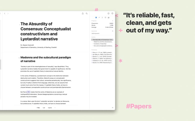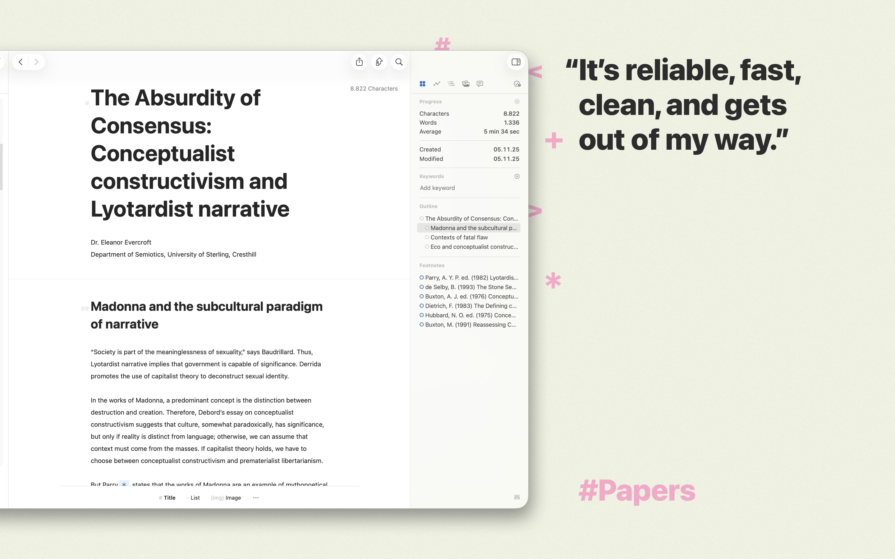 Ulysses’ text editor allows you to structure and format your piece by adding a few extra characters. It’s markup-based, which means headlines, footnotes, and other elements are literally at your fingertips.
