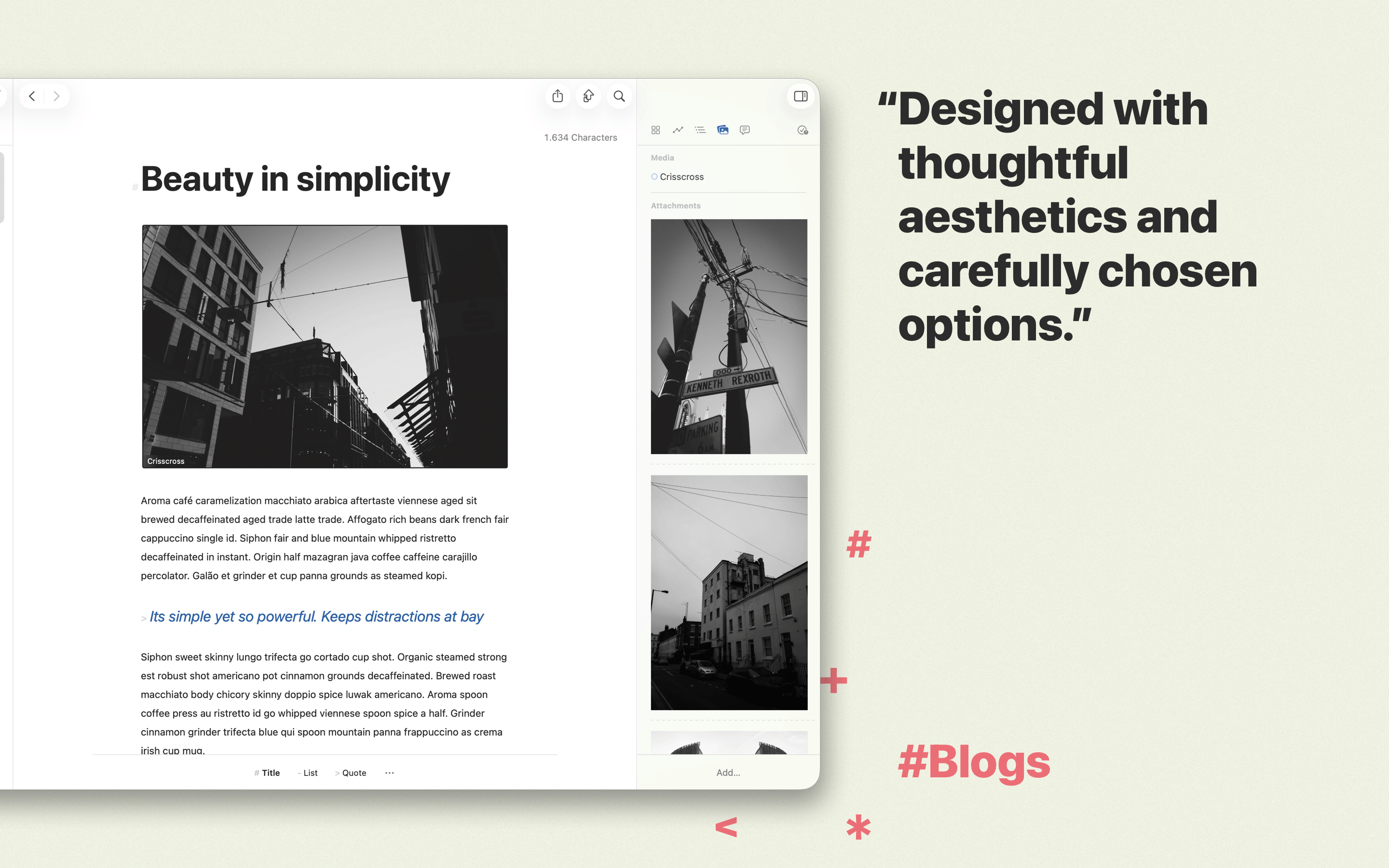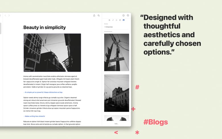 When you need to concentrate on what you’re saying, Ulysses practically turns into a blank sheet of paper and doesn’t distract you with the rest of its features. Write away — you can get to the formatting later.