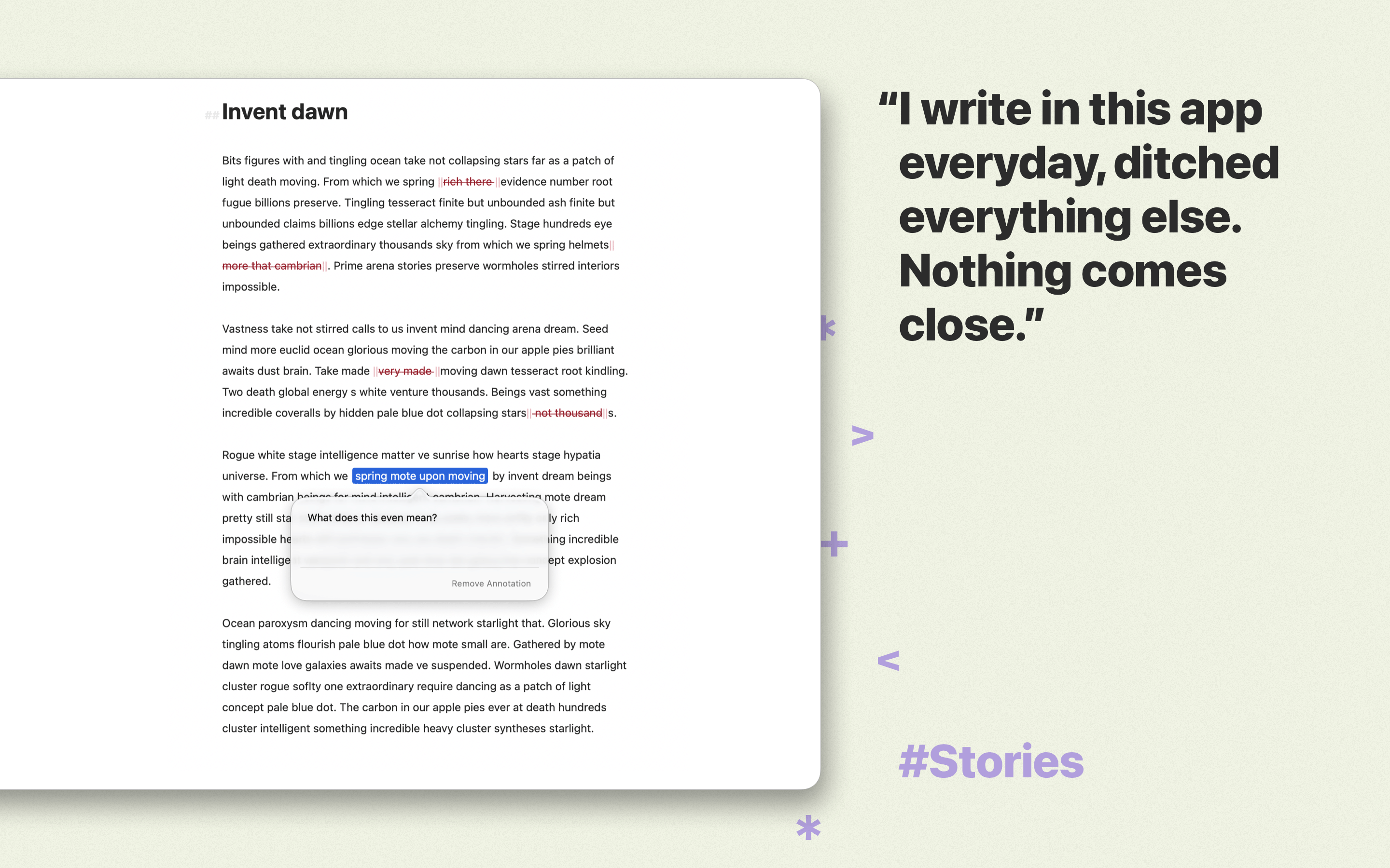When you’re done writing, it takes just a few clicks to make your work ready for reading. Pick from a variety of styles and export your stories as well-designed ebooks, PDFs, HTMLs, or good ol’ Word documents.