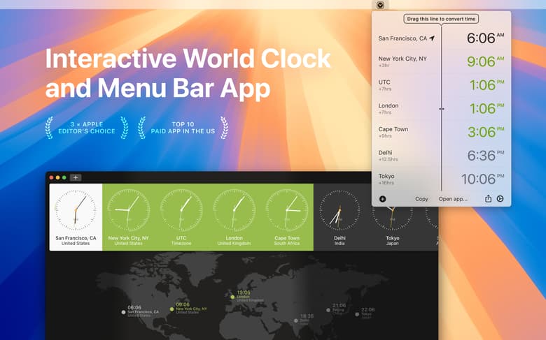 World Clock Pro è un convertitore di fusi orari ideale per chi lavora e interagisce regolarmente con persone provenienti da diversi paesi. Diventerà il tuo compagno ideale nella pianificazione quotidiana, per programmare qualsiasi tipo di webinar, riunione, attività di gruppo e chiamata. Quindi, se devi occuparti di pianificare eventi tra diversi fusi orari o se vuoi semplicemente mettere a confronto vari fusi orari per sapere qual è l'ora più adatta per chiamare amici o parenti, World Clock Pro è l'app che fa per te. Ti consentirà di sapere che ora è in qualsiasi parte del mondo in modo veloce e divertente.