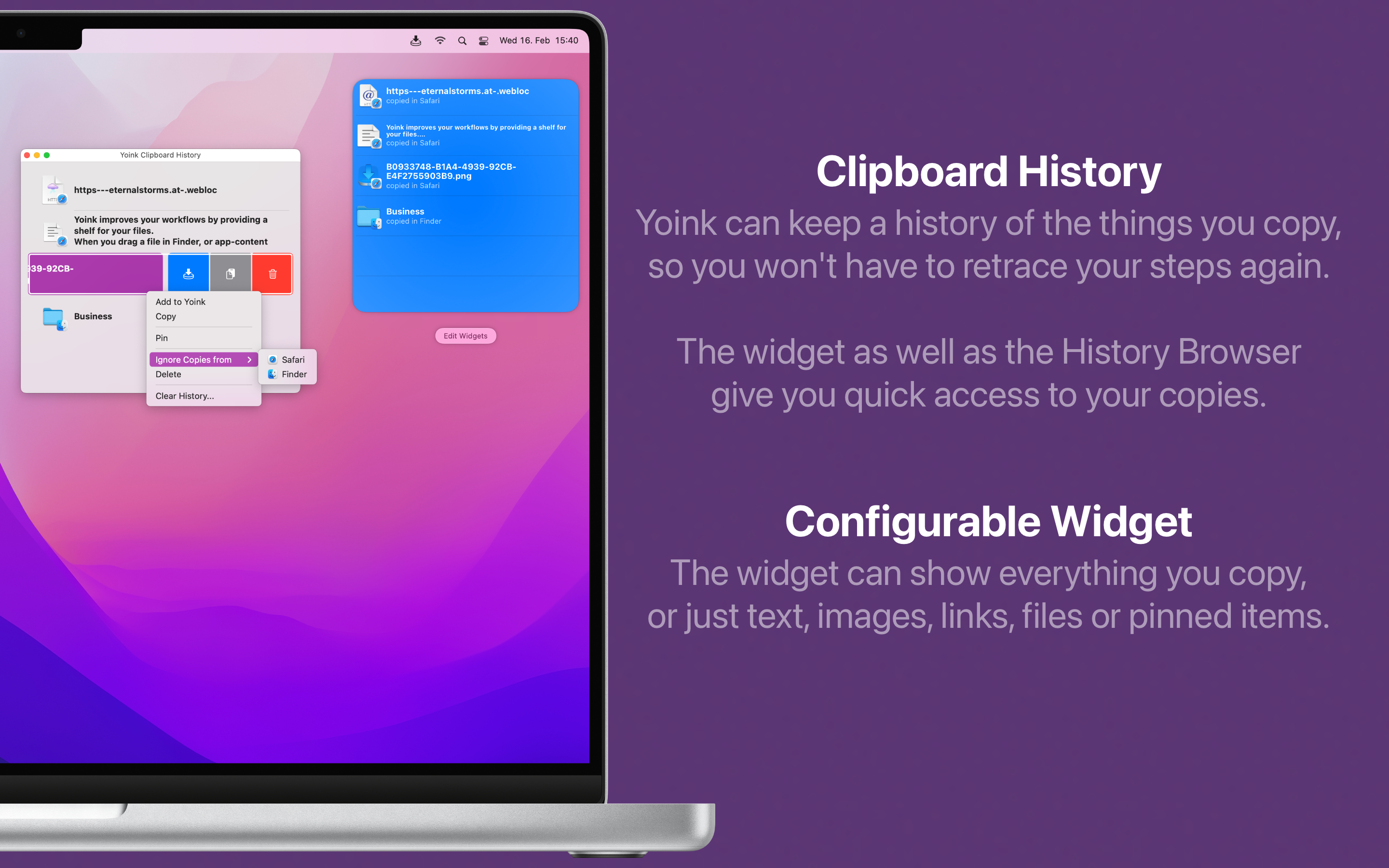 Yoink can remember up to 20 items of anything you copy in the background. Activate Clipboard History Widget through the Notification Center and easily recall clipboard contents from the widget or Yoink itself with its contextual menu.