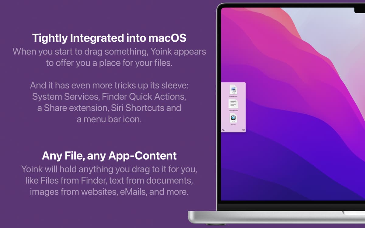 Yoink è un'utility di drag-and-drop per Mac che sposta file, app e qualsiasi elemento che possa essere trascinato e rilasciato in un'altra destinazione. Funziona come uno scaffale in cui puoi rilasciare i tuoi file, uno per uno oppure in gruppo, e poi inviarli nelle posizioni che preferisci sul computer. In un batter d'occhio.