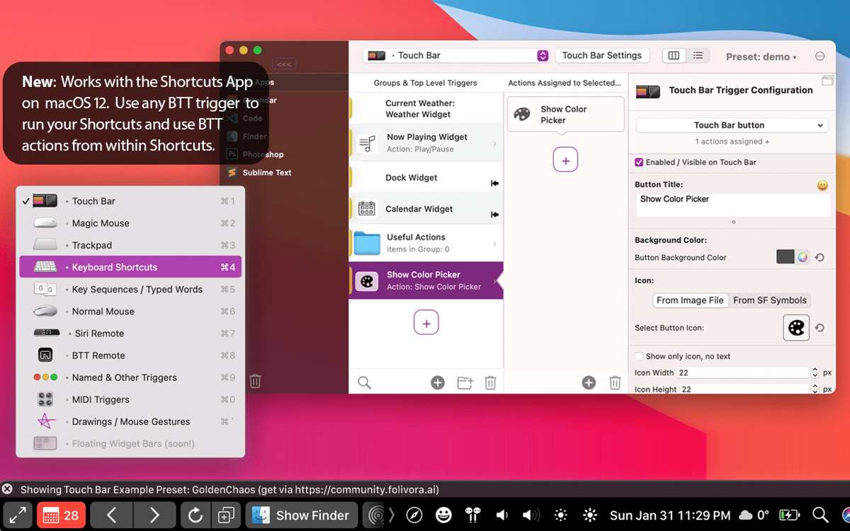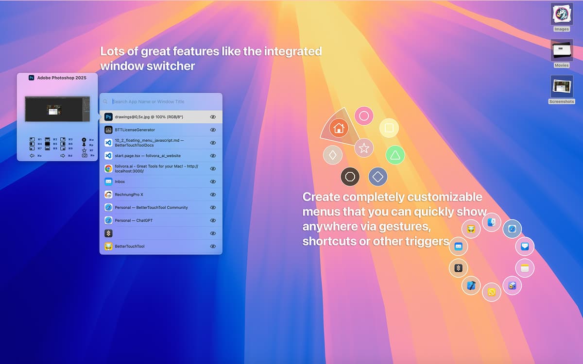 Mit BetterTouchTool (BTT) kannst du komplett anpassen und konfigurieren, wie die Eingabe in deinen Mac erfolgt. Das umfasst Tastaturbefehle, Mausgesten, Touch Bar Widgets, entfernte Trigger und mehr. Mit der App ist es nicht nur einfach, alle Sequenzen zu steuern, sondern sie erweitert auch die Standardfunktionen des Mac, damit du deinen Arbeitsplatz einrichten kannst, wie du ihn brauchst.