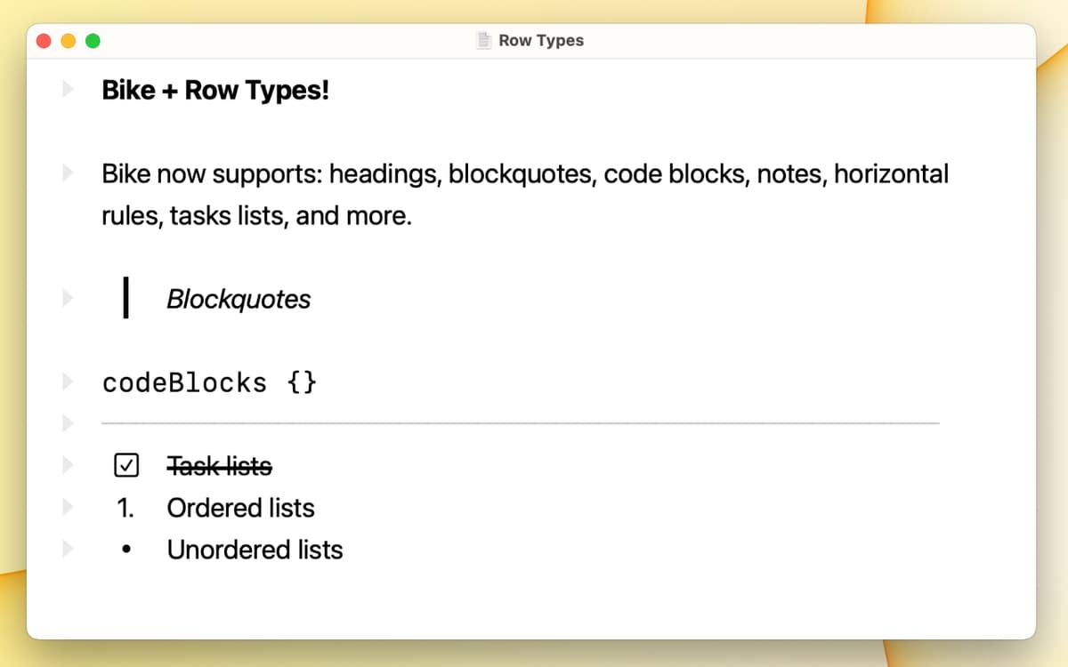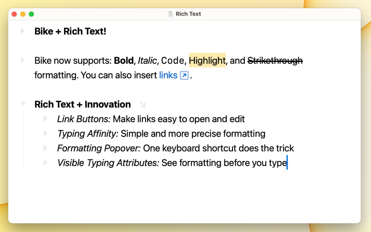 Formatieren Sie Ihre Skizzierungen ganz einfach mit dem Formatierungseditor von Bike. Mit der Hervorhebungsfunktion, den Codeblöcken und natürlich den Links gehen Sie über die Grundlagen hinaus. Rufen Sie die Formatierungspalette mit einem einfachen Tastaturkürzel auf: Befehl + E.