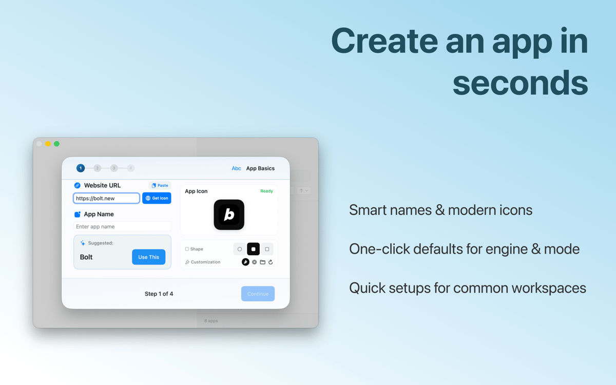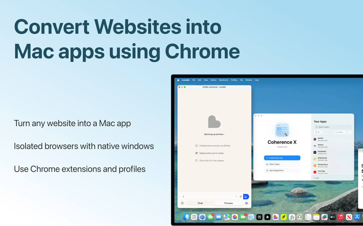 Coherence Pro 2 ermöglicht dir, praktisch jede Website in eine App für deinen Mac zu transformieren. Jede App ist komplett isoliert, anpassbar und eigenständig. Mit Chrome im Hintergrund funktioniert die App perfekt mit praktisch allen Websites und ermöglicht dir, deine Chrome-Erweiterungen und -Profile zu übernehmen. Wähle einen benutzerdefinierten App-Modus und eine unbegrenzte Anzahl Apps.
