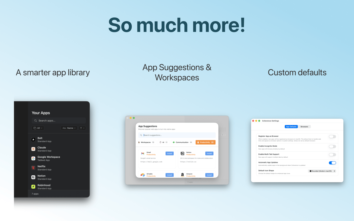 Coherence Pro gibt dir Raum für Kreativität. Mit einer Reihe unterschiedlicher Funktionen kannst du Apps erzeugen, die als Arbeitsbereiche funktionieren. Wenn du beispielsweise nicht mehr zwischen mehreren Plattformen wechseln möchtest, kannst du Coherence Pros Multi-Tab-Oberfläche nutzen, um die meistbesuchten Websites in einer App zu kombinieren.
