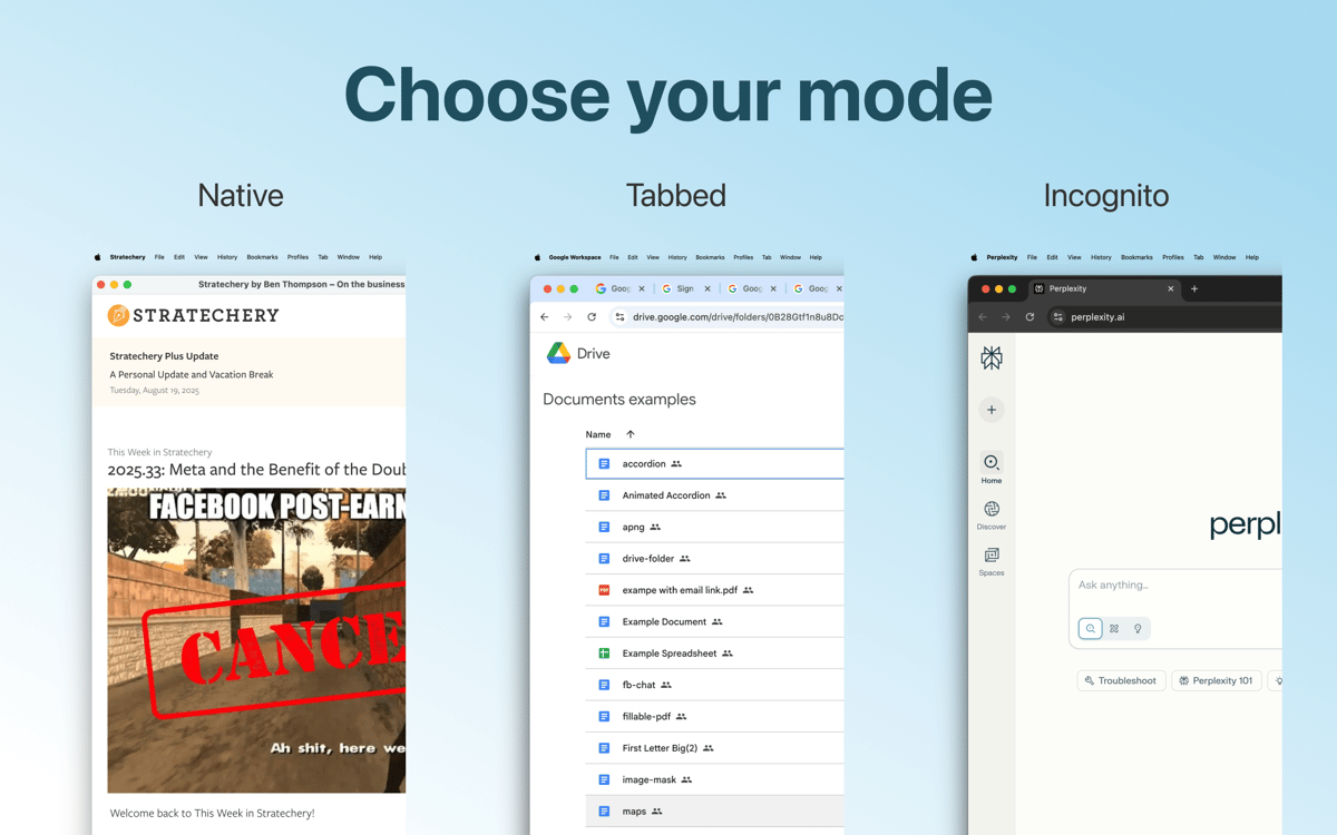 Die App verfügt über drei Modi für die Benutzeroberfläche: eine Ein-Fenster-App, die traditionelle Chrome-ähnliche Ansicht und das Multi-Tab-Design. Wähle nach deinem Bedarf – gleich ob es eine native immersive Oberfläche oder ein Bereich für Multitasking werden soll. Du kannst dieselben Einstellungen bei anderen Apps kopieren.