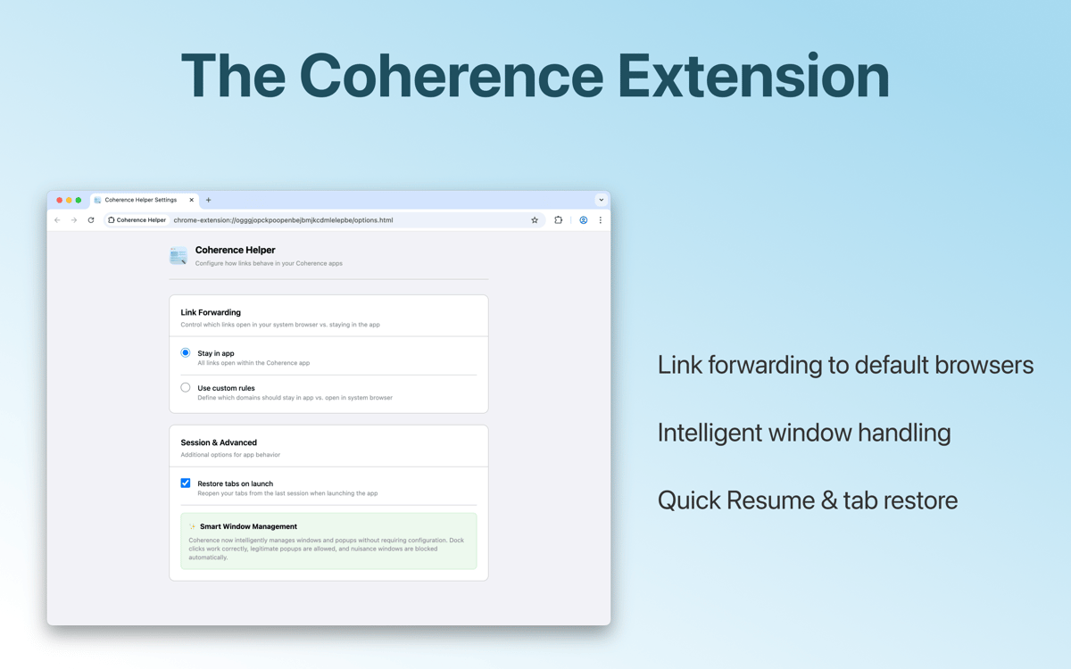 Coherence Pro kann automatisch Erweiterungen und Profile aus deinen Chrome-Instanzen importieren. Wenn du also eine Social-Media-Anwendung erstellst, kannst du 1Password, Pocket und andere nützliche Erweiterungen zu Aufwertung deiner App hinzufügen. Coherence Pro verfolgt auch, welches deine bevorzugten Erweiterungen sind.