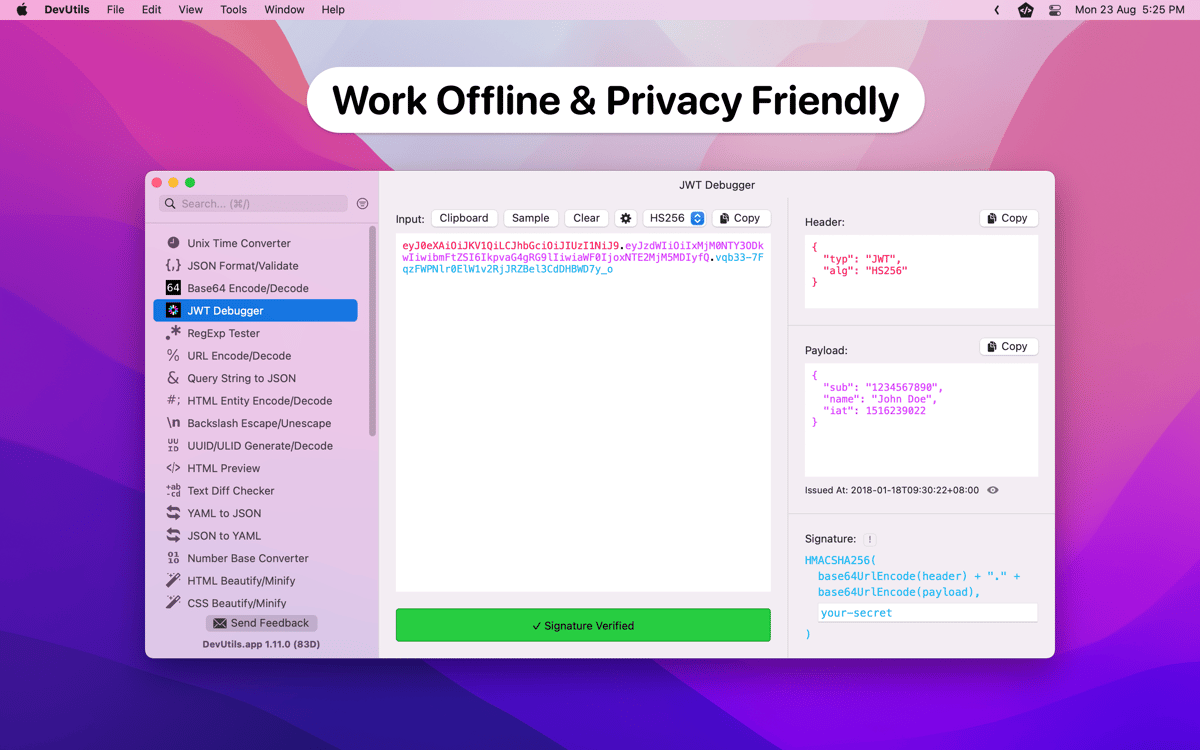 Ganz gleich, ob du JSON formatieren, ein JWT-Token debuggen oder einen UNIX-Zeitstempel konvertieren musst, mit DevUtils erledigst du all dies mit einem Klick. Greife auf eine riesige Sammlung von Entwickler-Tools zu, die alle offline funktionieren. Und dank intelligenter Erkennung musst du nicht einmal zwischen ihnen wechseln – DevUtils sieht, was du in der Zwischenablage hast, und wählt automatisch das richtige Tool aus.