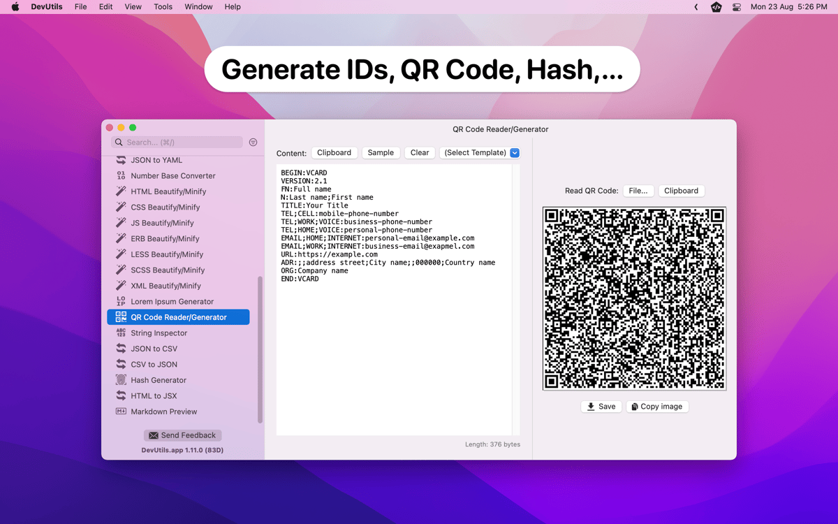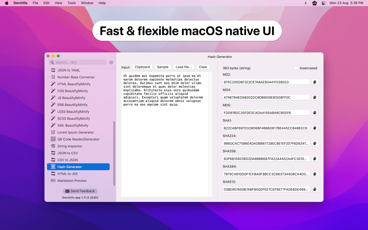 Alles, was du mit DevUtils erledigst, findet direkt auf dem Computer statt. Du musst keine JSON-Strings oder vertrauliche Daten an eine fragwürdige Website senden – DevUtils führt alle Prozesse lokal auf dem Mac aus.