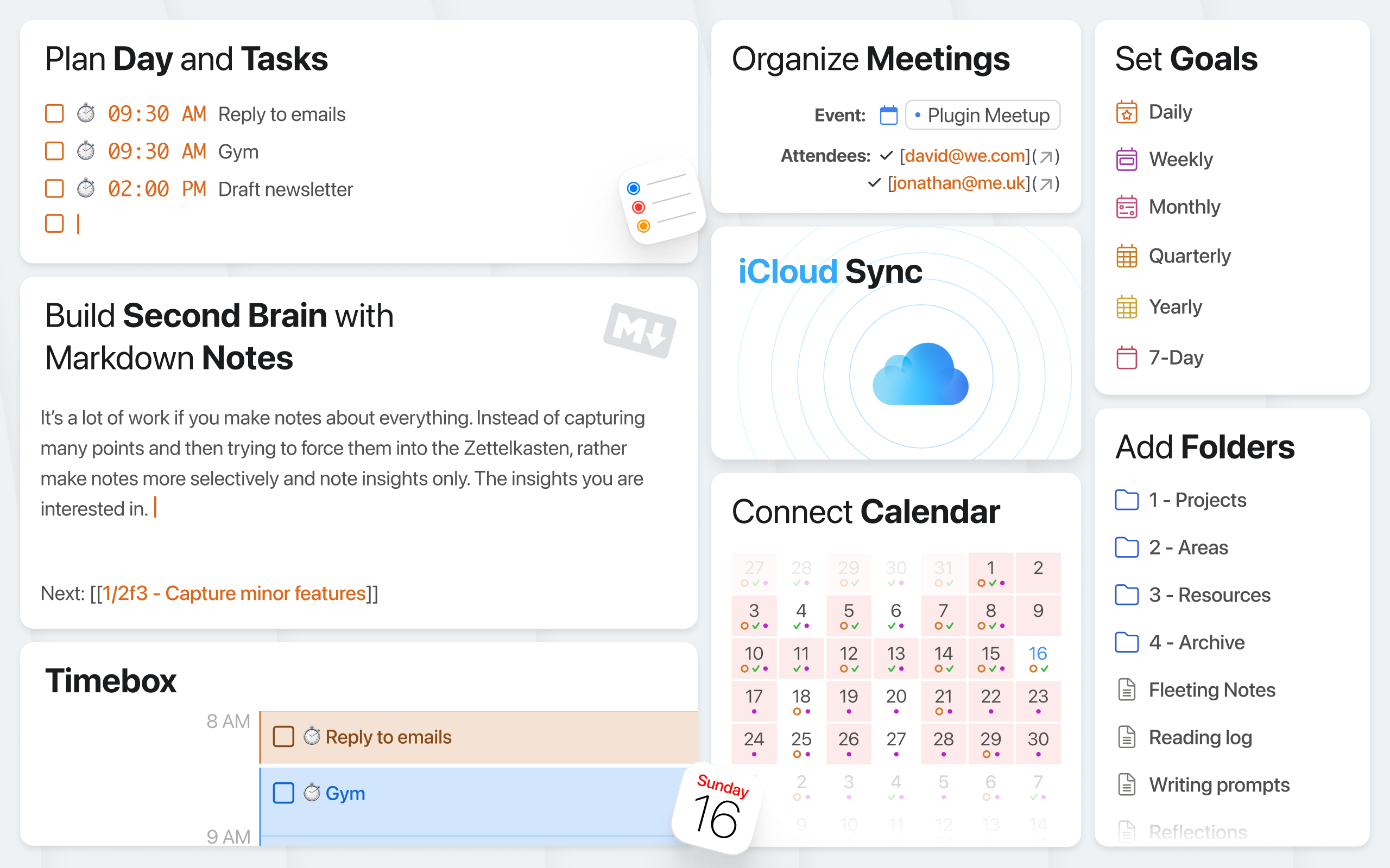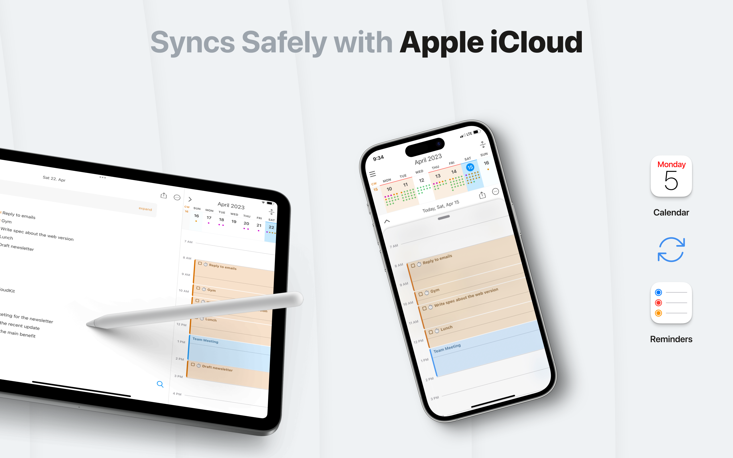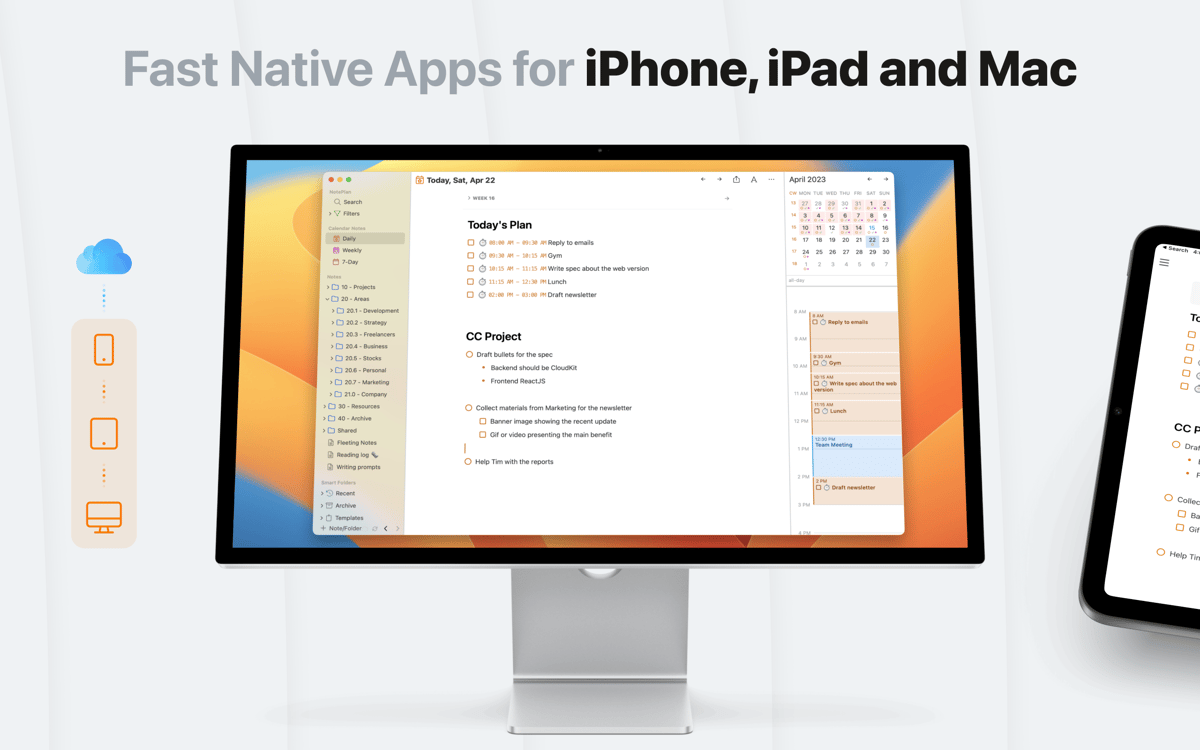 Die App wurde um einen aktiven, reaktionsfähigen Kalender herum entwickelt. Sobald du Notizen und Aufgaben mit einer Frist einträgst, werden sie automatisch in deinen Kalender übernommen. Damit hast du die Übersicht über das, was du erledigen musst. Dazu lässt sich der native Kalender reibungslos mit externen Plattformen wie iCal oder Google Kalender synchronisieren, um sicherzustellen, dass du niemals eine Frist versäumst.