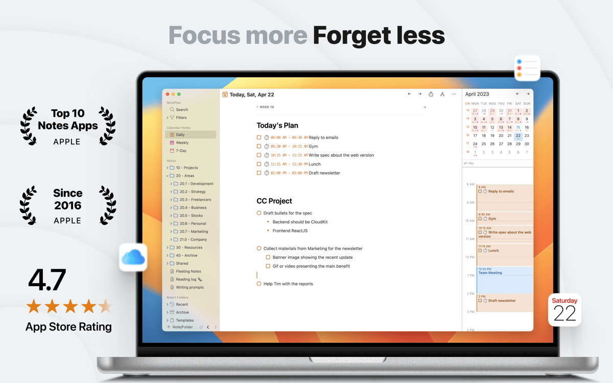 NotePlan ist eine minimalistische, schöne App für Notizen, die sich zum Ziel gesetzt hat, die Probleme zu lösen, die die meisten Apps auf dem Gebiet plagen. Mit ihr kannst du eine Produktivitätsmaschine errichten, die nicht nur das Erfassen von Notizen ermöglicht, sondern auch einen Kalender, Bullet Journaling und Listen bereithält. Keine vollgestopften To-do-Listen oder hastig gekritzelten Informationen an den Rändern deines Kalenders: Jede Notiz, die du aufschreibst, findest du wieder. Mit einer schönen Darstellung, die Farbkodierungen für fortlaufende Aufgaben verwendet, wirst du NotePlan nicht mehr missen wollen. Und mit der praktischen Synchronisierung mit iOS, musst du das auch nicht.